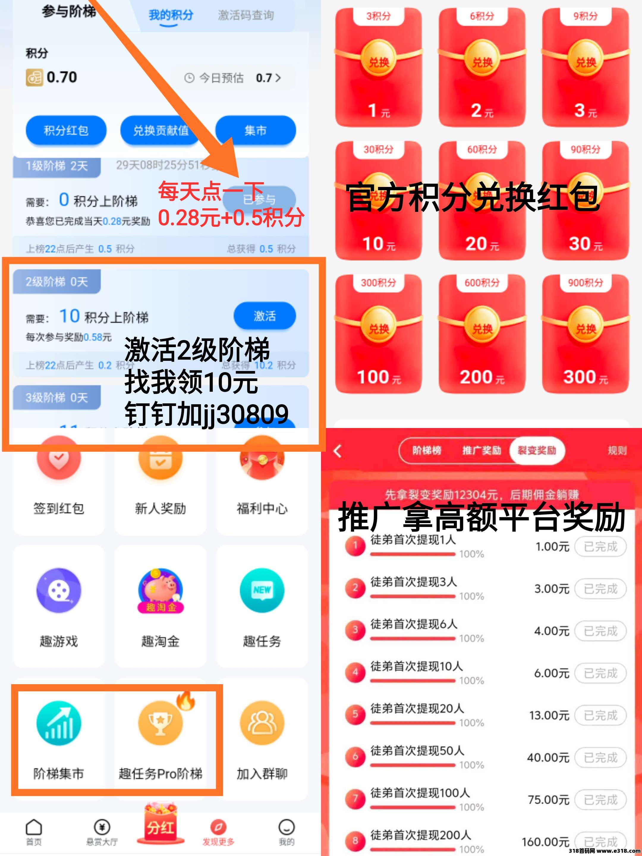 3.推广:每日可获得2.74现金红包+积分。8重福利+20%下级积分,积分**越滚越多,以上1积分=1米,集市交易,或者官方兑换红包