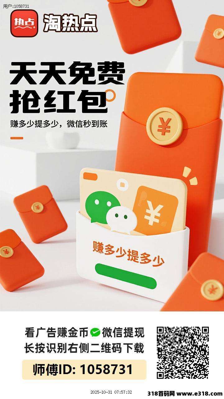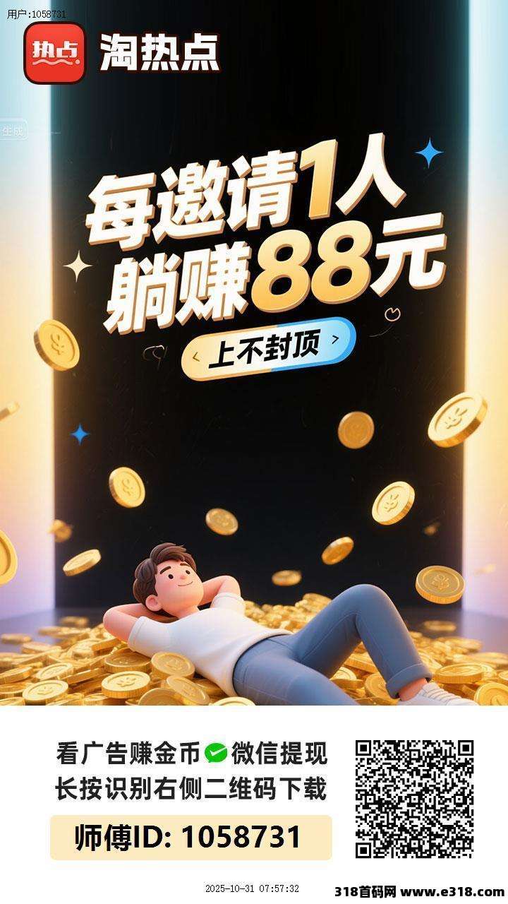 淘热点App,今日首码活动,多多福利拉满,每日零撸10-50元,轻松赚!新用户注册即享88元奖励,观看广告赚取收益,轻松赚钱!