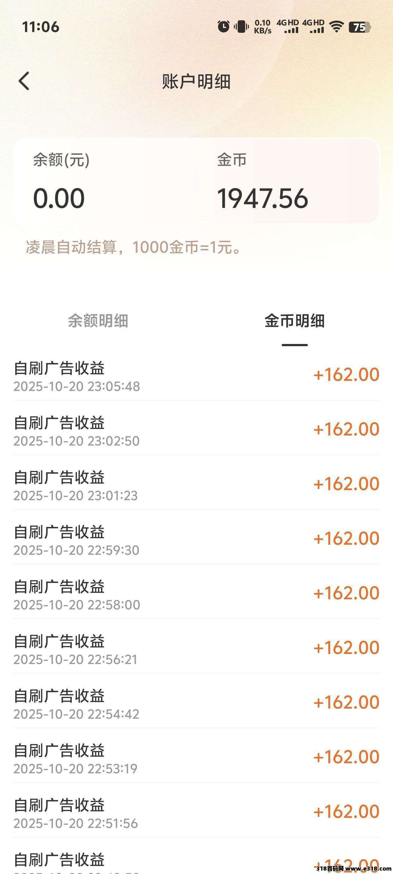 看完1个广告,中间间隔20秒再看,凌晨自动释放到余额