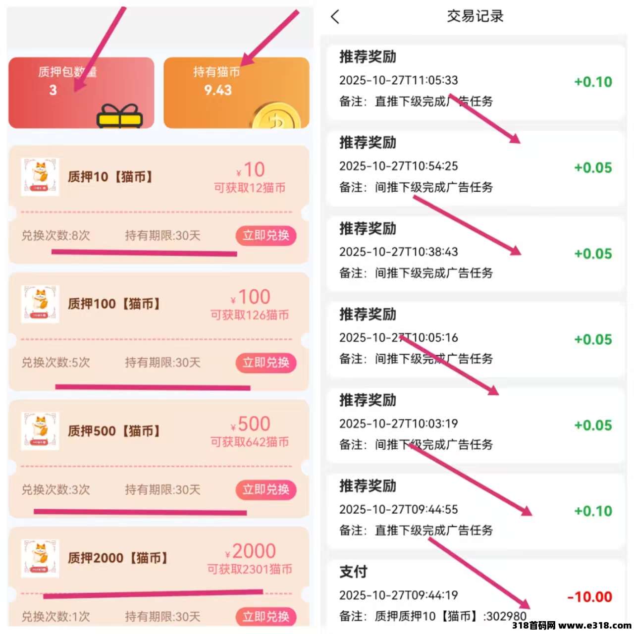 现在普通会员需要质押10猫币成为有效用户才可进行转赠,质押10猫币每天芬虹0.4猫币,观看7条广告每天,1猫币=1米,直推好友观看广告收益10%间推用户5%