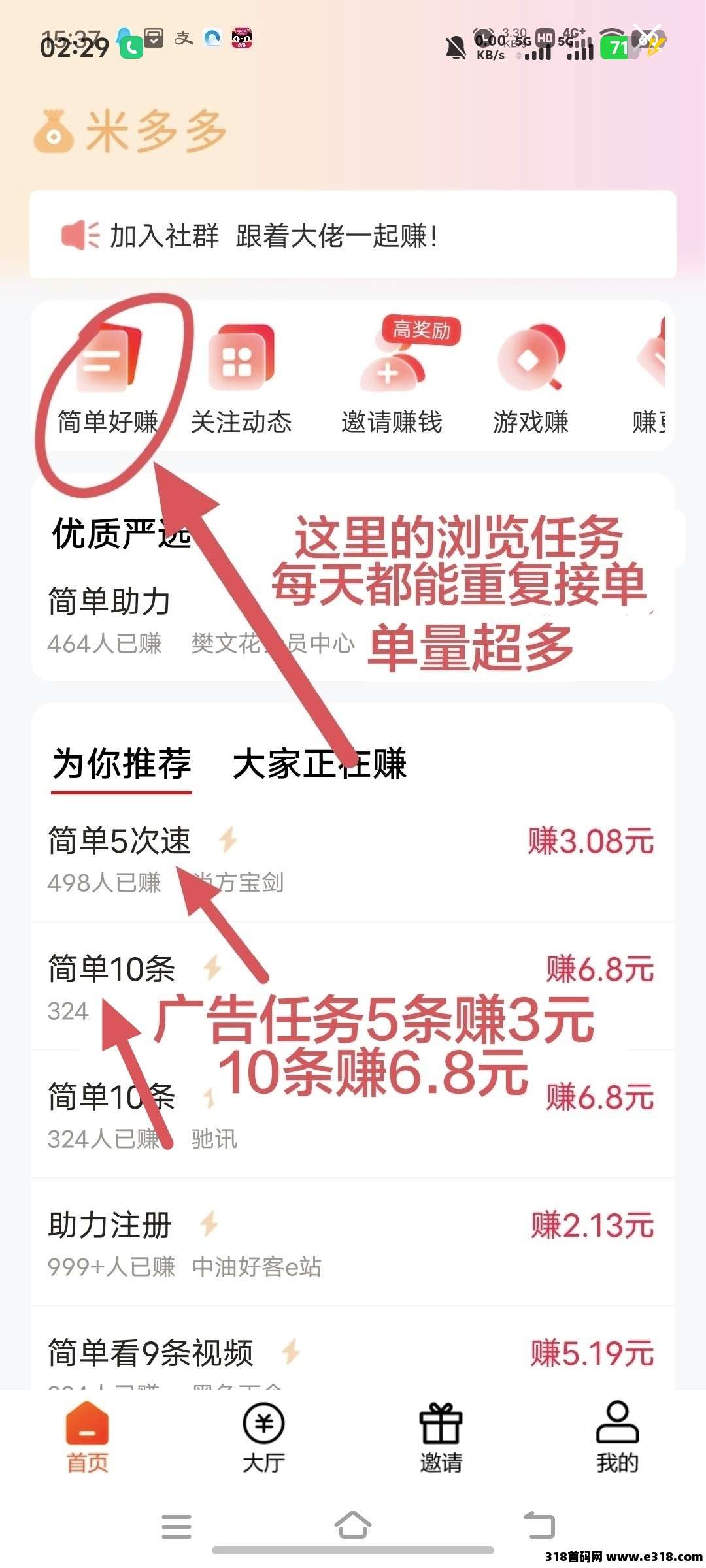 米多多,首页左上角的简单好赚任务→按要求浏览几秒截图提交就赚0.17元一单,单量超多,每天都能重复接单。一个小时随便撸十几二十块