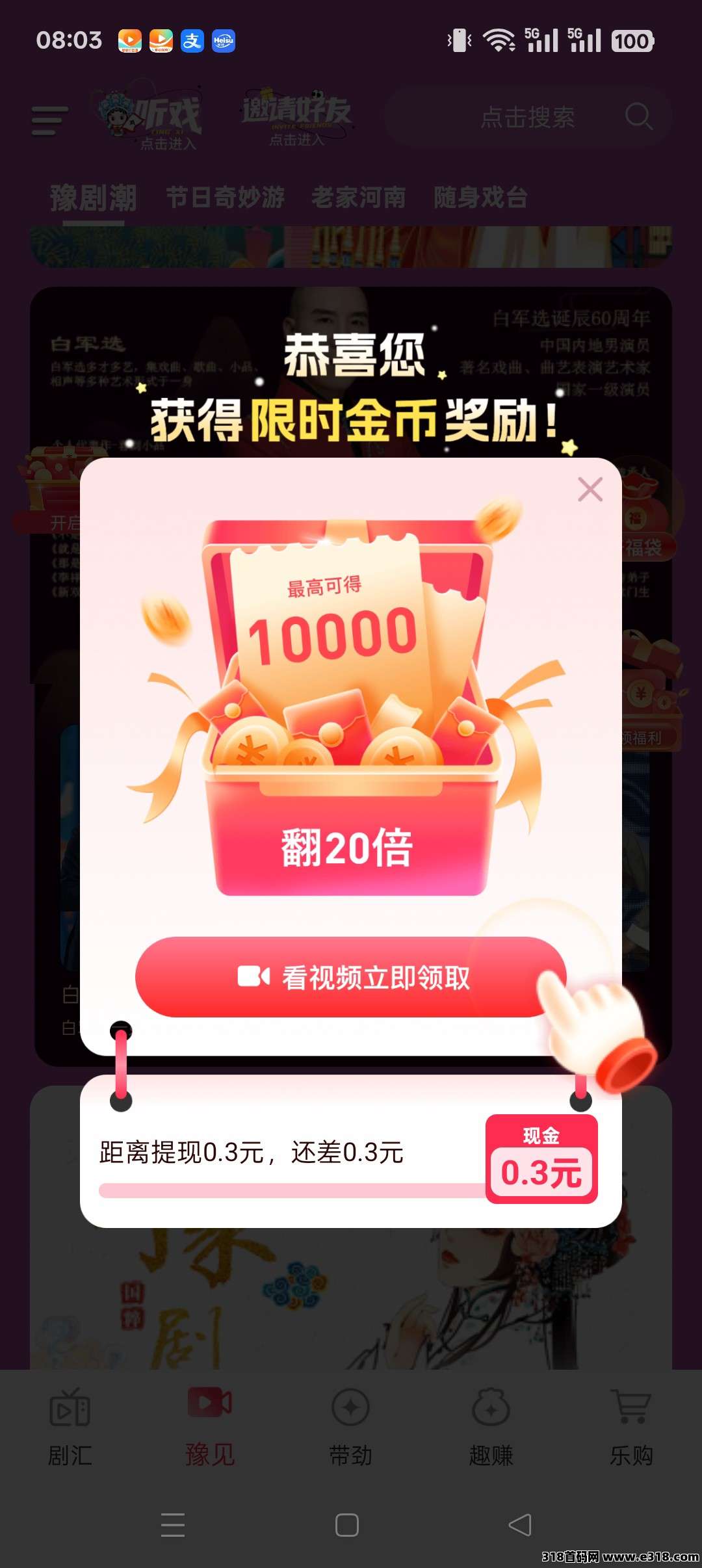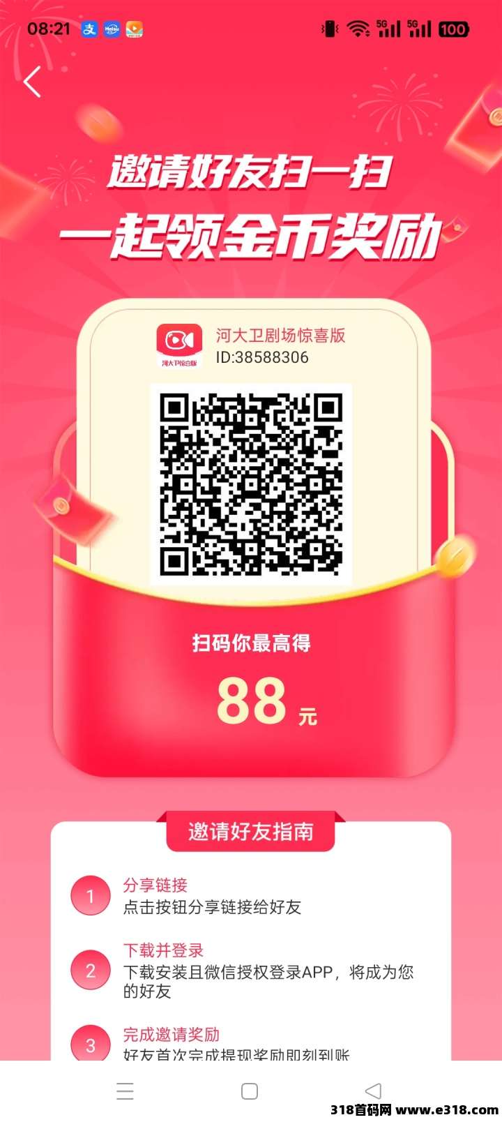 河大卫剧场惊喜版,零撸广告赚,保底收益高,团队模式,邀请日入百米,威信扫码注册必得金b,可提现