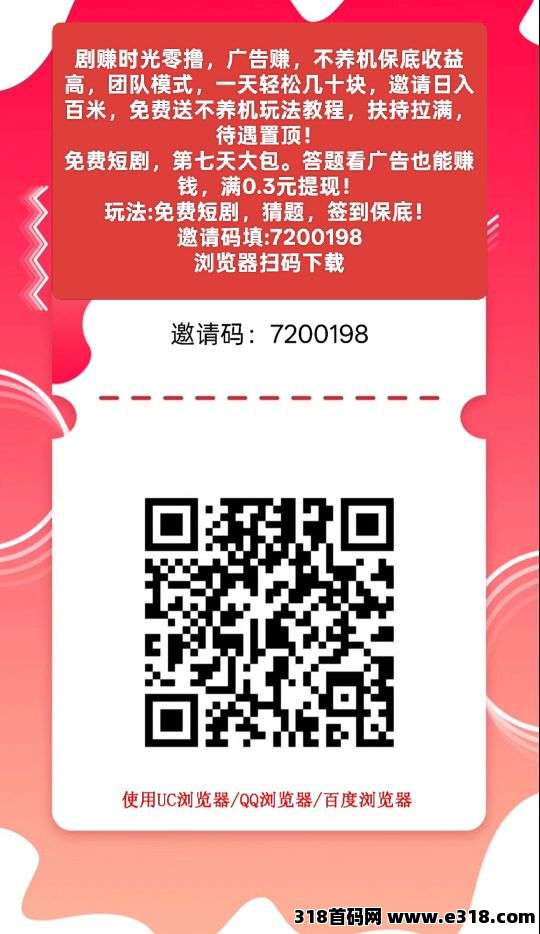 剧赚时光零撸,广告赚,不养机保底收益高,团队模式,一天轻松几十块,邀请日入百米,免费送不养机玩法教程,扶持拉满,待遇置顶!