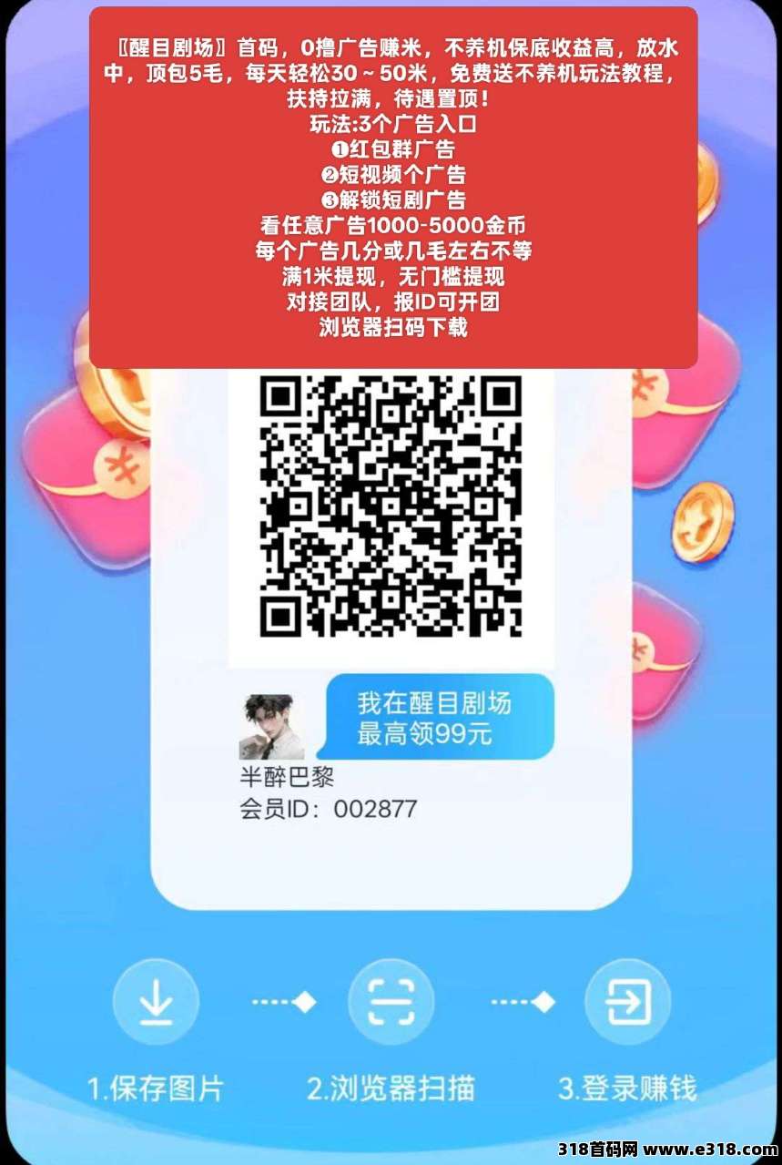 〖醒目剧场〗首码,0撸广告赚米,可全自动挂机,不养机保底收益高,放水中,顶包5毛,每天轻松30~50米,免费送不养机玩法教程,扶持拉满,待遇置顶!