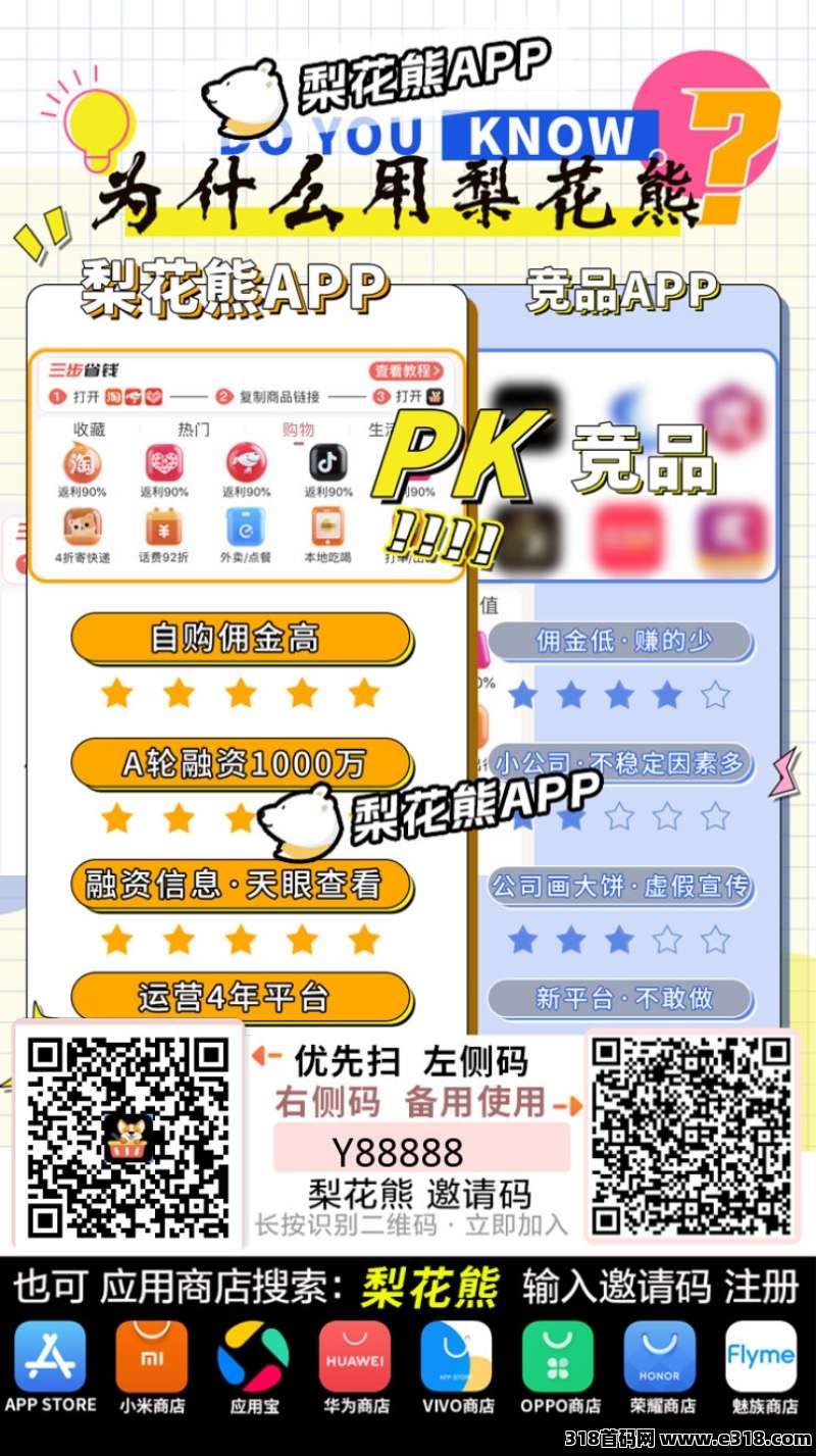 长按文中图片二维码注册,或在手机应用商店下裁梨花熊,注册时填写官方推荐码:Y88888.