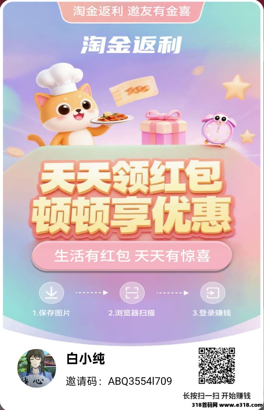 淘金返利,零撸广告赚+购物赚,保底收益高,邀请日入百米,团队模式,苹果+安卓双端上线,