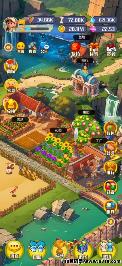 1.农场:新人初始只有3块地,随着等级上升不断解锁新的土地,最多12块地,播种-浇水 耐心等待农作物成熟即可(施肥可增产)。