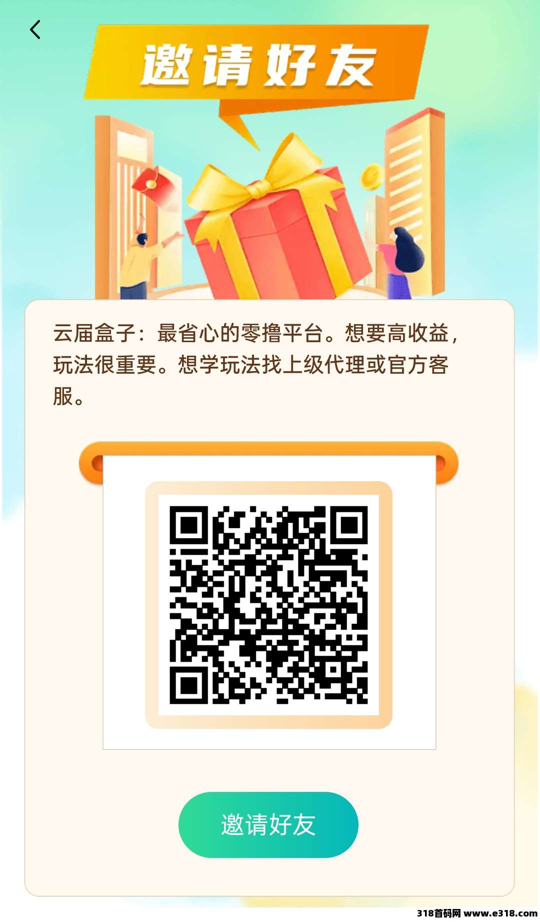 云届盒子首码,零撸看广告软件,保底收益高,邀请日入百米,团队模式,元宝+钻石模式,一天轻松几十块!