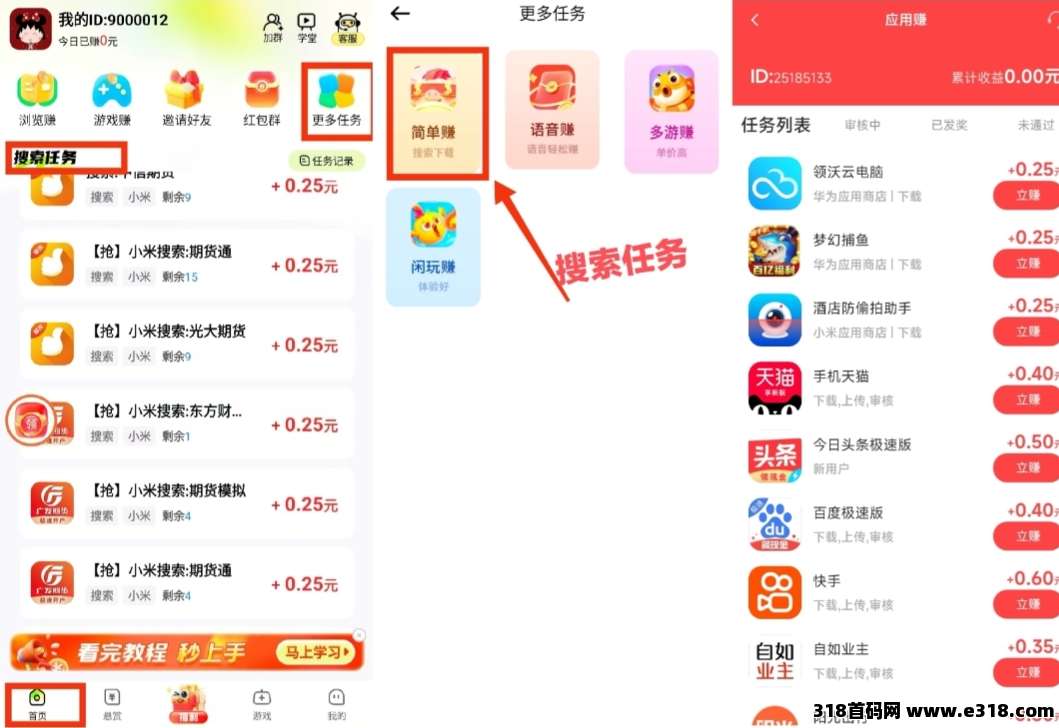 首页【搜索任务】和【更多任务】中的【简单赚】里面的任务都是搜索赚,搜索赚操作简单,只要在指定应用商店下载APP并简单试玩30S就可以得到奖励