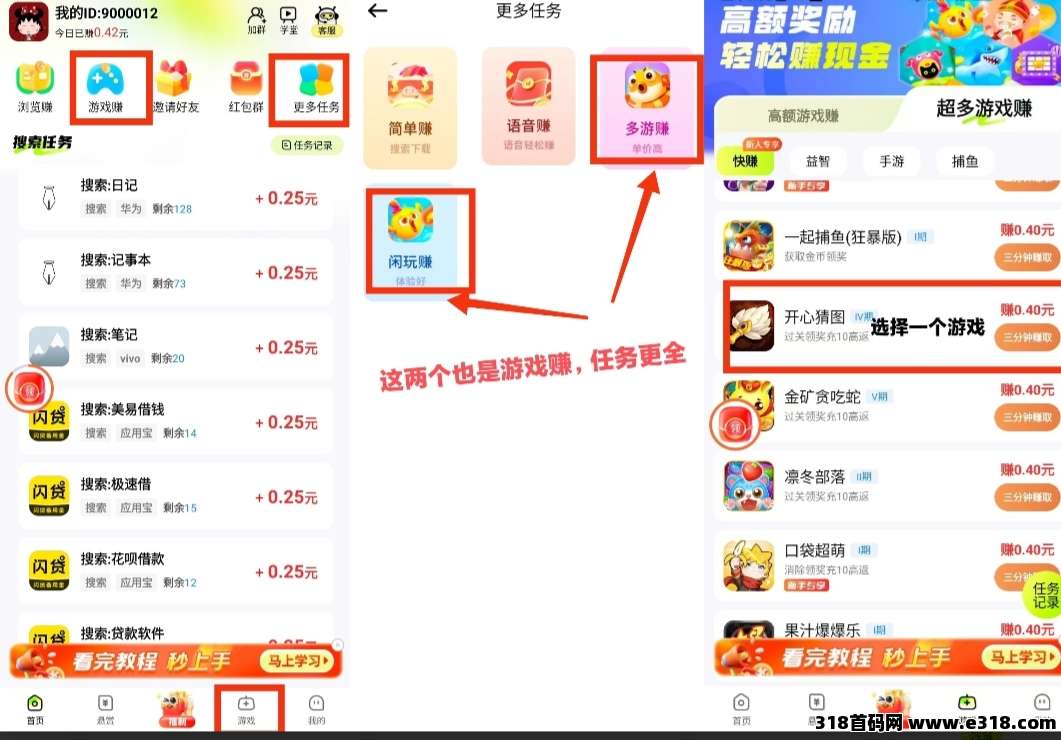 从首页的【游戏赚】和菜单栏【游戏】以及【更多任务】都可以进入游戏赚钱,在游戏列表中选择想玩的游戏就可以开启赚钱之旅。