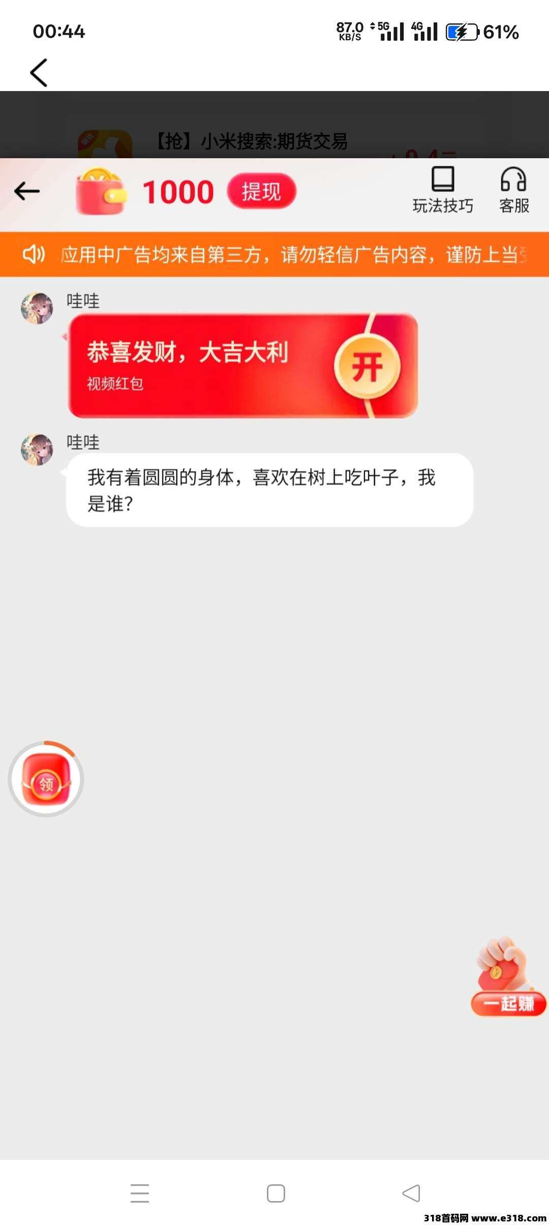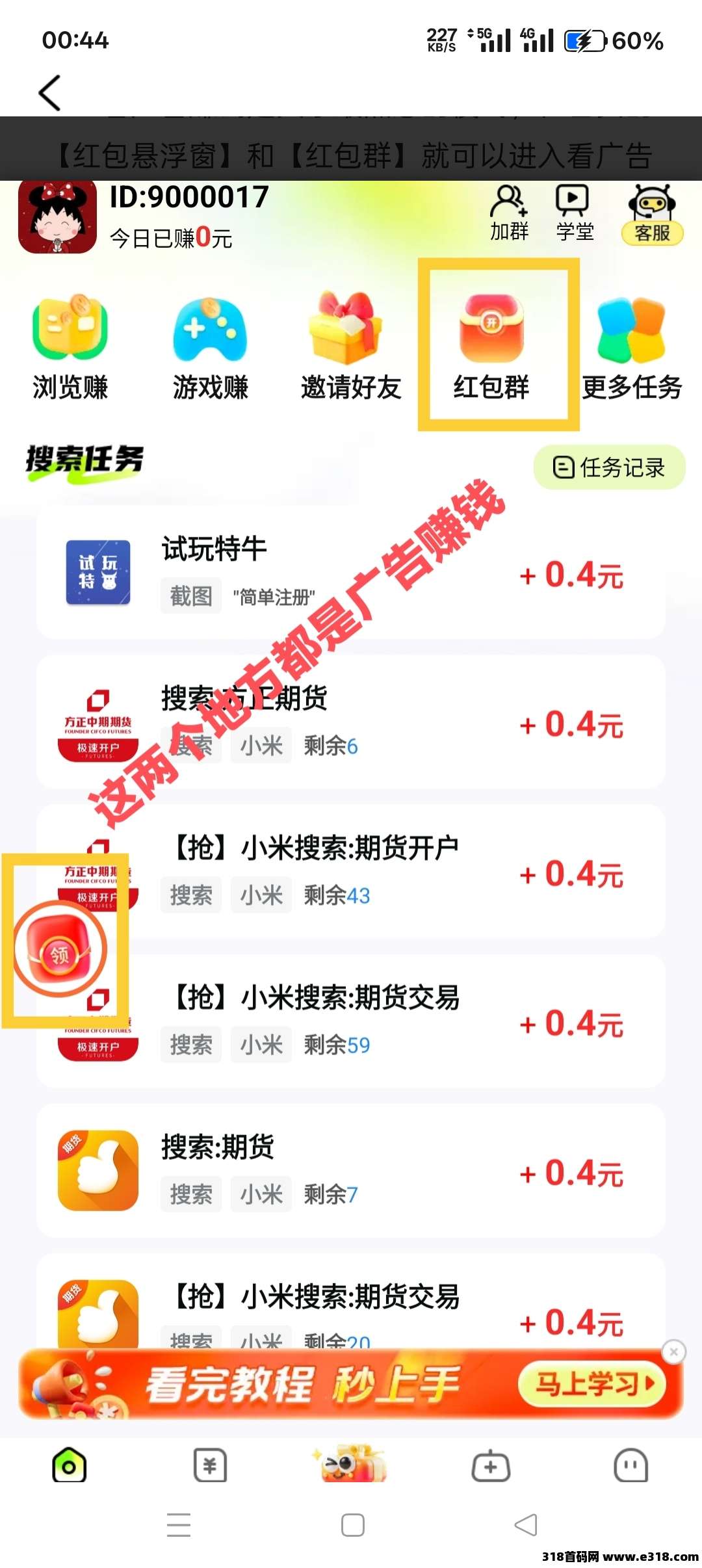 看广告赚钱是大家最熟悉的模式,在首页的【红包悬浮窗】和【红包群】就可以进入看广告赚钱版块。