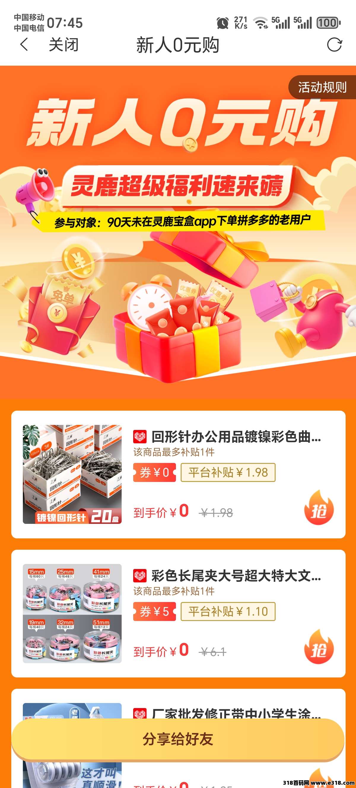 下载完app后,打开登录,到首页,点击“新人0元购”免费薅一款商品!!!