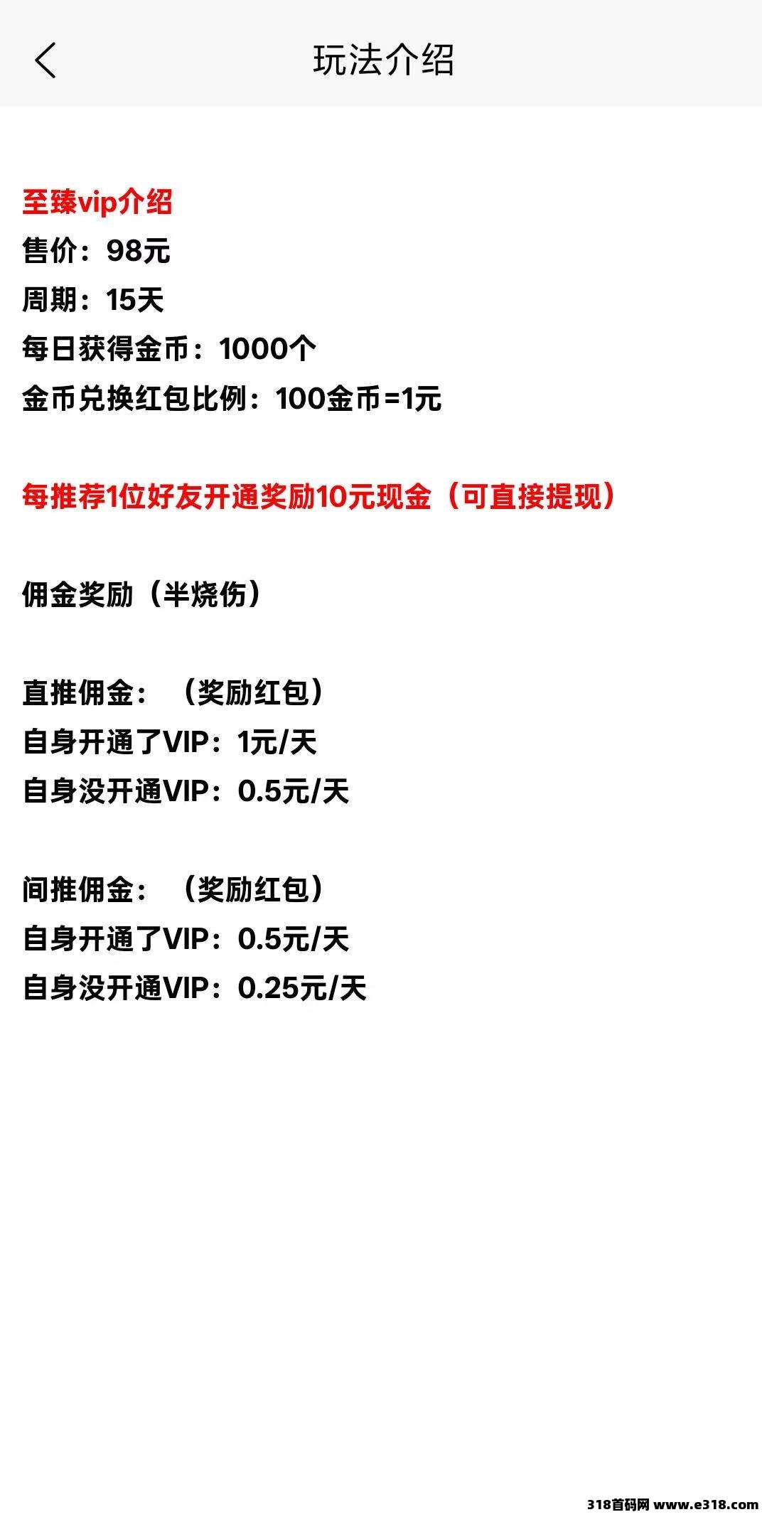 投资玩法:98元(21-23号预售88元)开通至臻VIP每天不用看广告直接领取1000金币,金币?直接兑换现金提现支付宝。