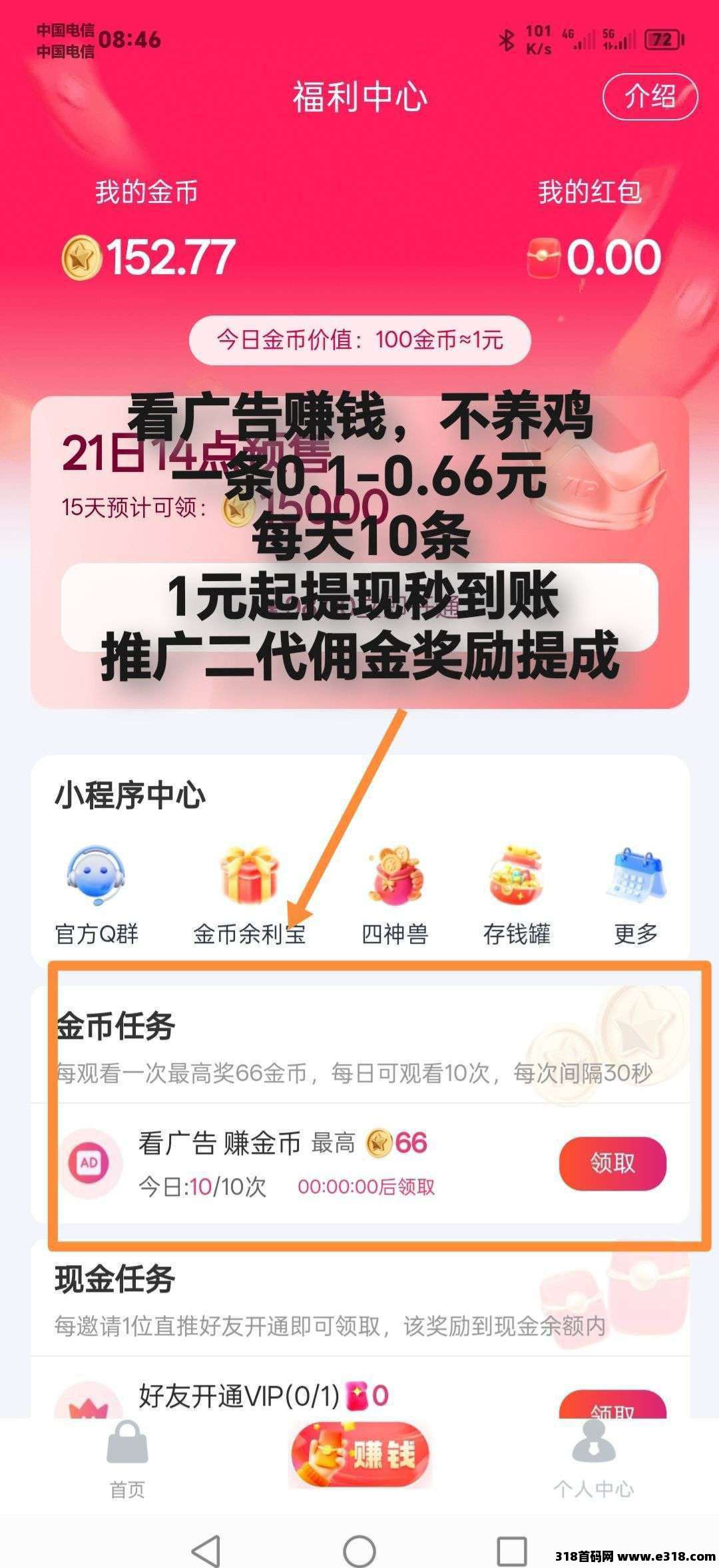 每天看10个广,得150-660金币,金币兑换红包,100金币=1米,满1米可提现!