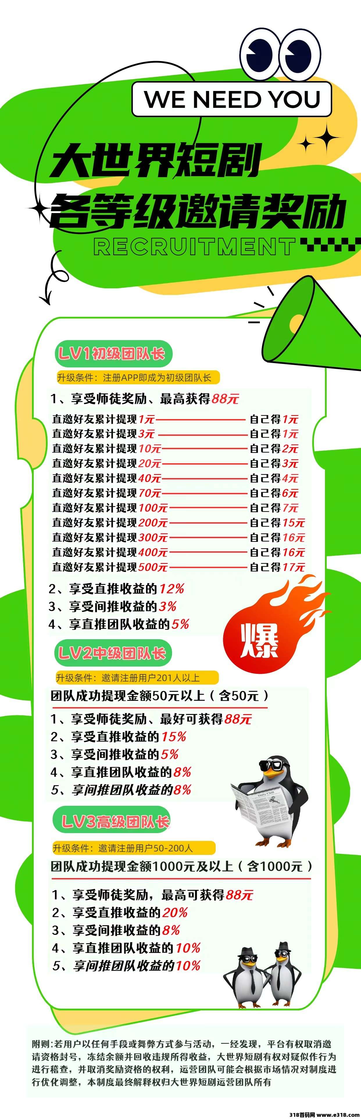 大世界短剧,零撸广告赚,保底收益高,不养机,大放水中,团队模式,邀请日入过百米,