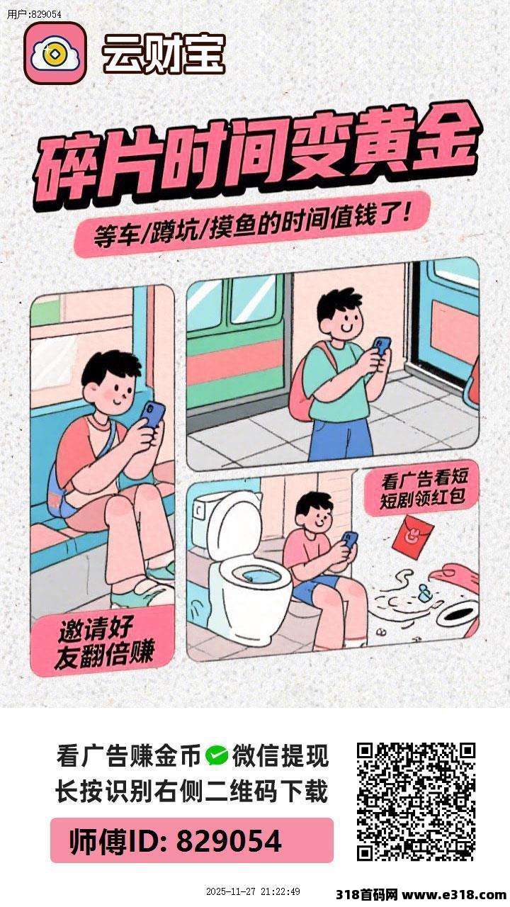 云财宝大公司出品,零撸每天保底收益高,广告赚,团队模式,邀请月入百米,每天业余时间赚零花,上班族宝妈首选直接提微信,不实名,多劳多得,