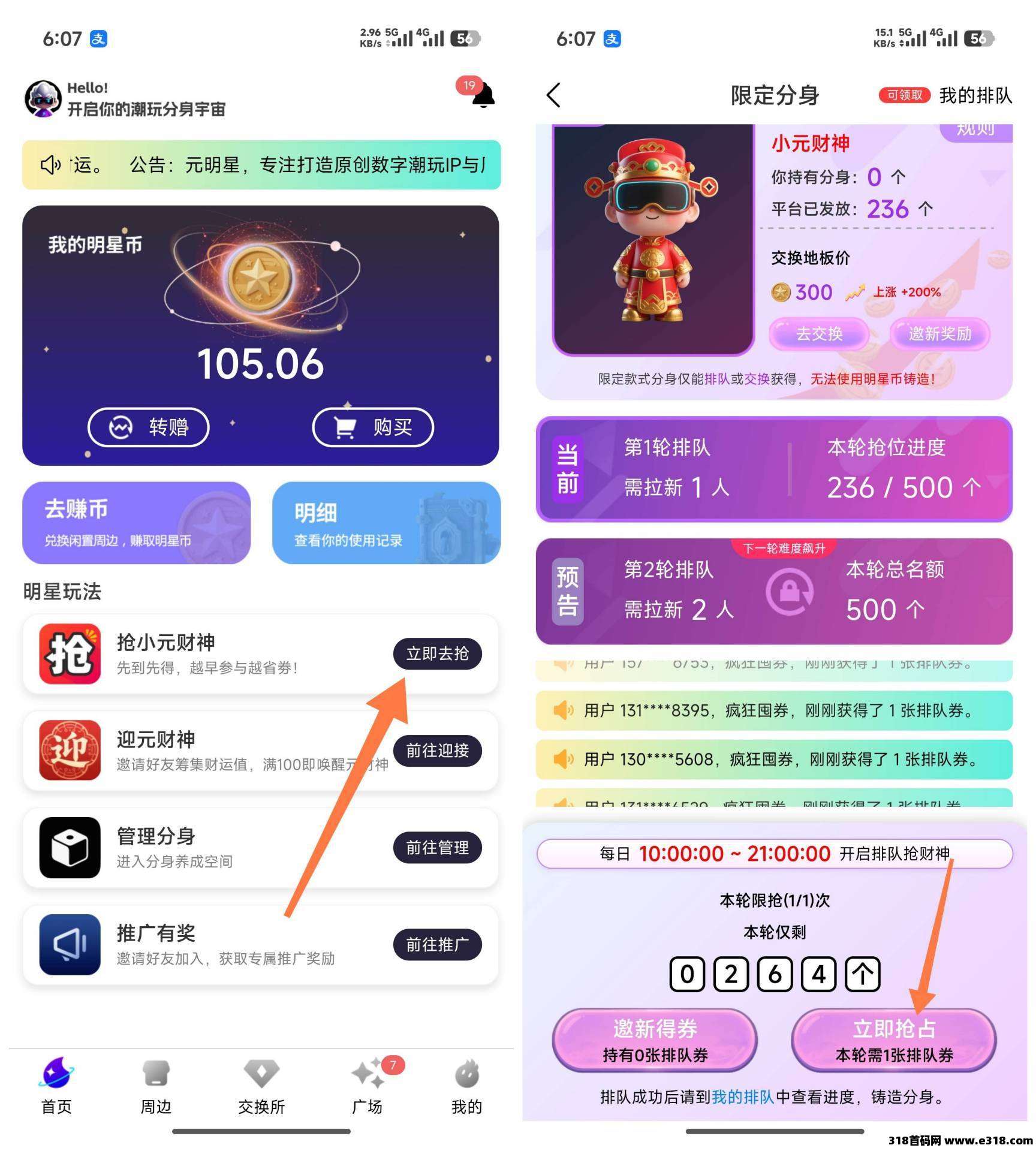 元明星现在新用户注册实名之后需要拉2个新用户才能领取一个(小元财神)空投了 邀请5个就是2个(小元财神)相当于6张排队倦 目前来看 依旧有利润 保底50+