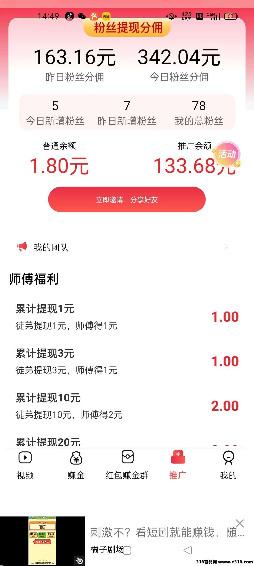 大世界新台子,简单玩法,直接开包,官方有活动补贴,个人看广告提米提10到13,提20到29,提五十到81,推广提现也是一样的提50到81