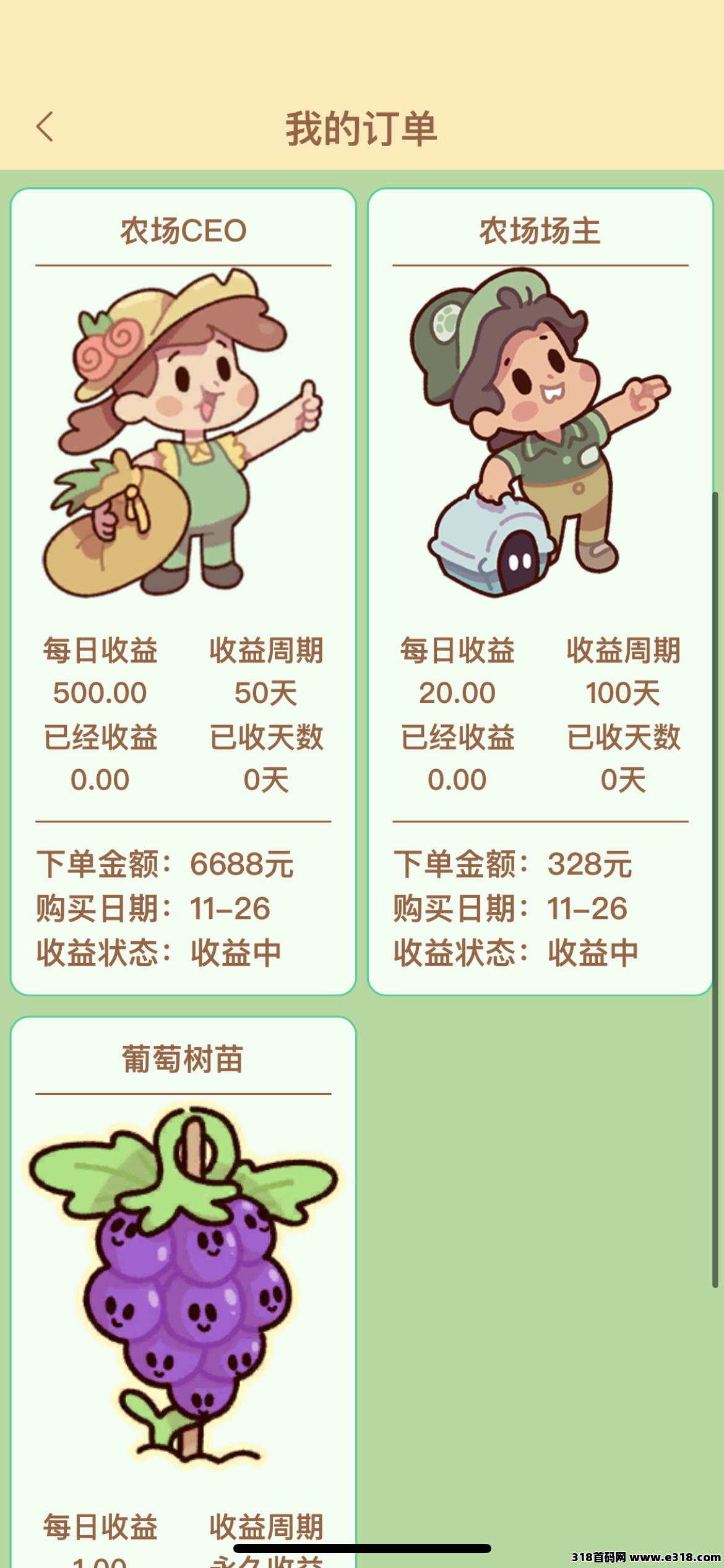 《农场时光》,刚刚上线,注册登录平台送永久葡萄苗,激活后永久每天收益一元。收益一元起提秒到。该项目以实体运营为基础,可联系客服随时考察!