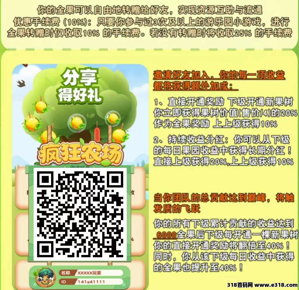 【疯狂农场】种田玩游戏,开垦土地精心栽,收获果实,用户每天获取果树收益,每日0点产出金果,项目方兜底市场,内置提米功能,稳定无忧,快来开启你的梦幻田园冒险之路。