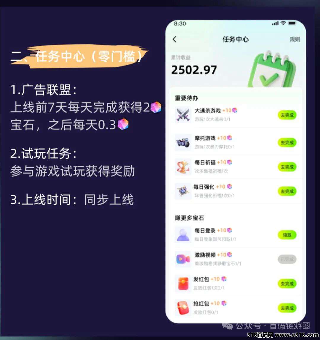 20号上线之后前七天做完成任务可获得每天2个宝石,七天后每天可获得0.3宝石//
