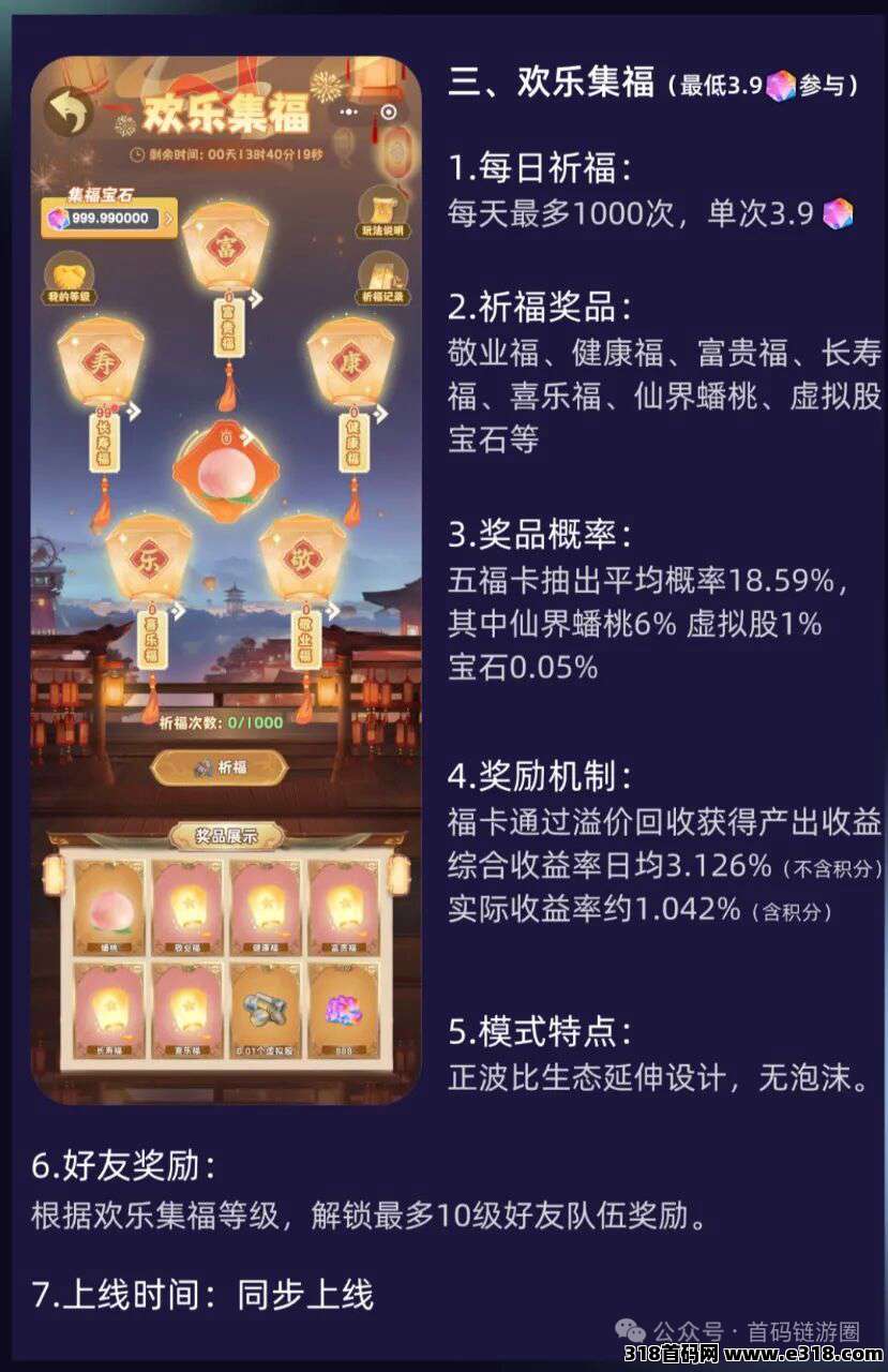 每次可用3.9宝石祈福,当日最多1000次,每次祈福92.95%概率得到各种福卡(可溢价3.126%卖出,日*化3.126%×30天=月化93.78%)当日祈福当日可卖出,随进随出