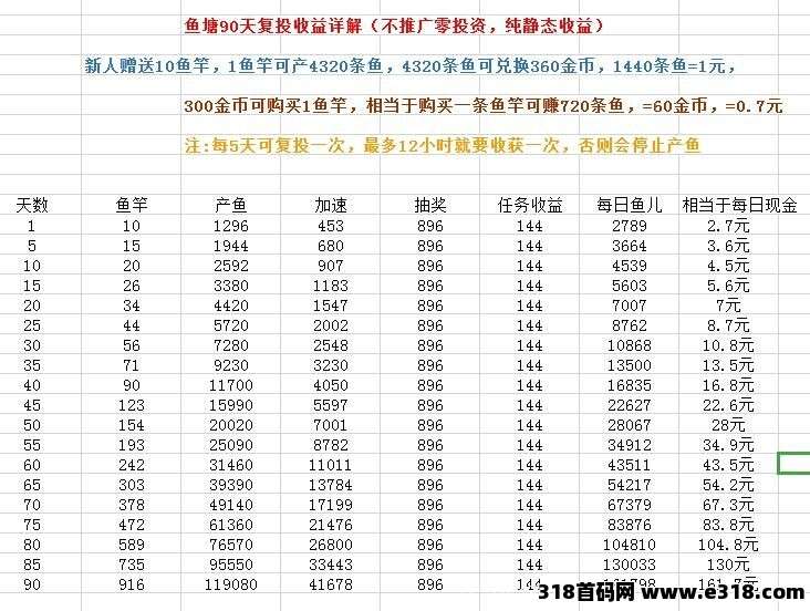 一个鱼竿一个月可以产4000多小鱼,邀请人加速产,鱼竿越多每天撸得越多