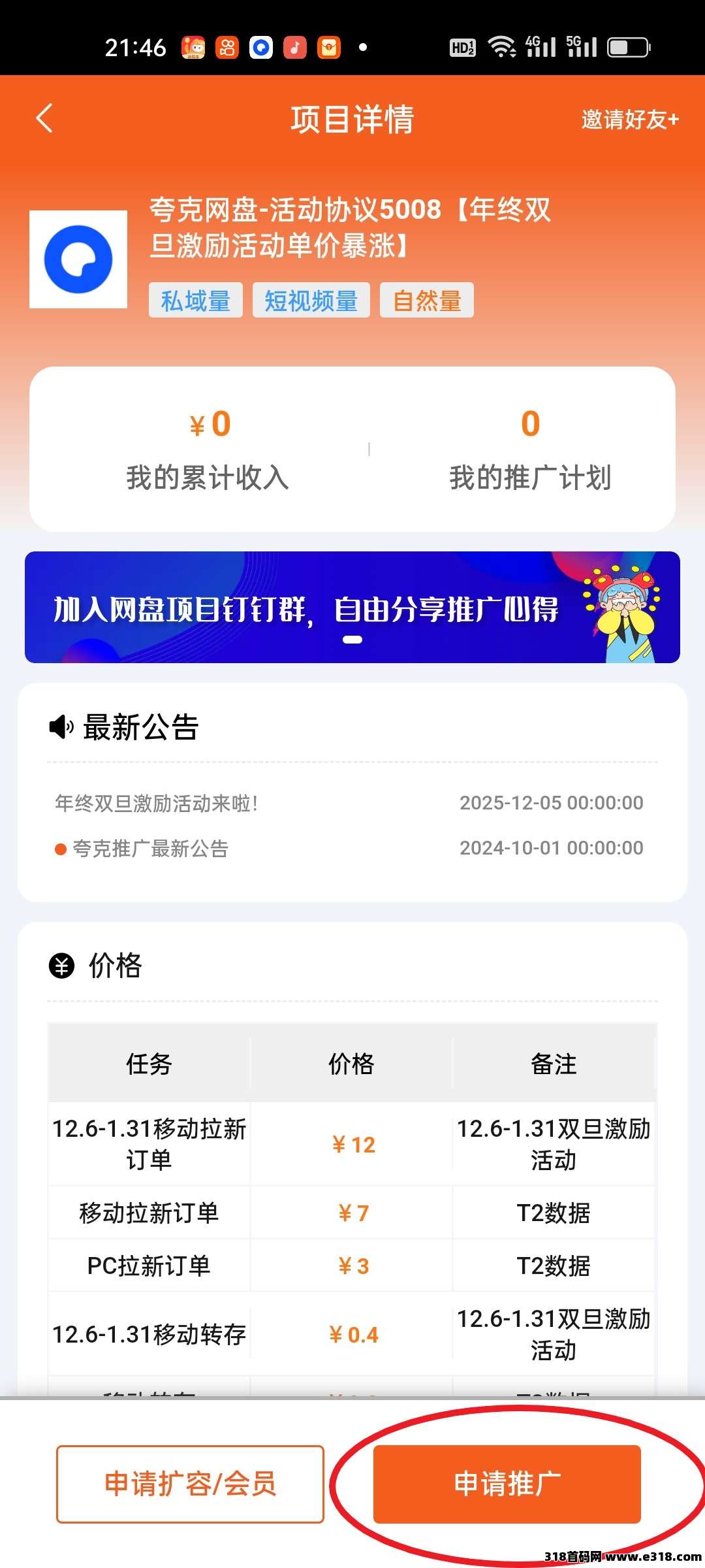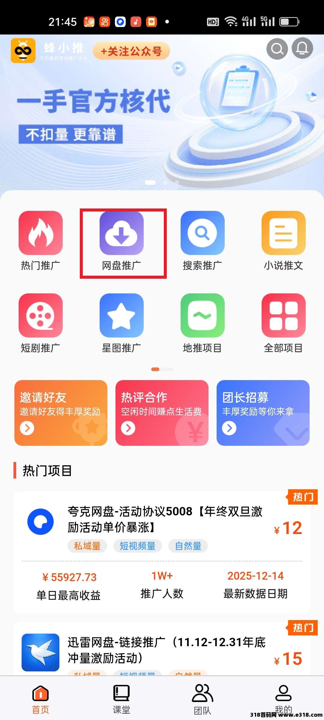 免费申请官方资格:通过蜂小推公众号下载APP,用手机号注册后,完成实名认证(方便后期进行佣金提现),然后在“网盘推广”中选择“夸克网盘”项目,进行权限申请;