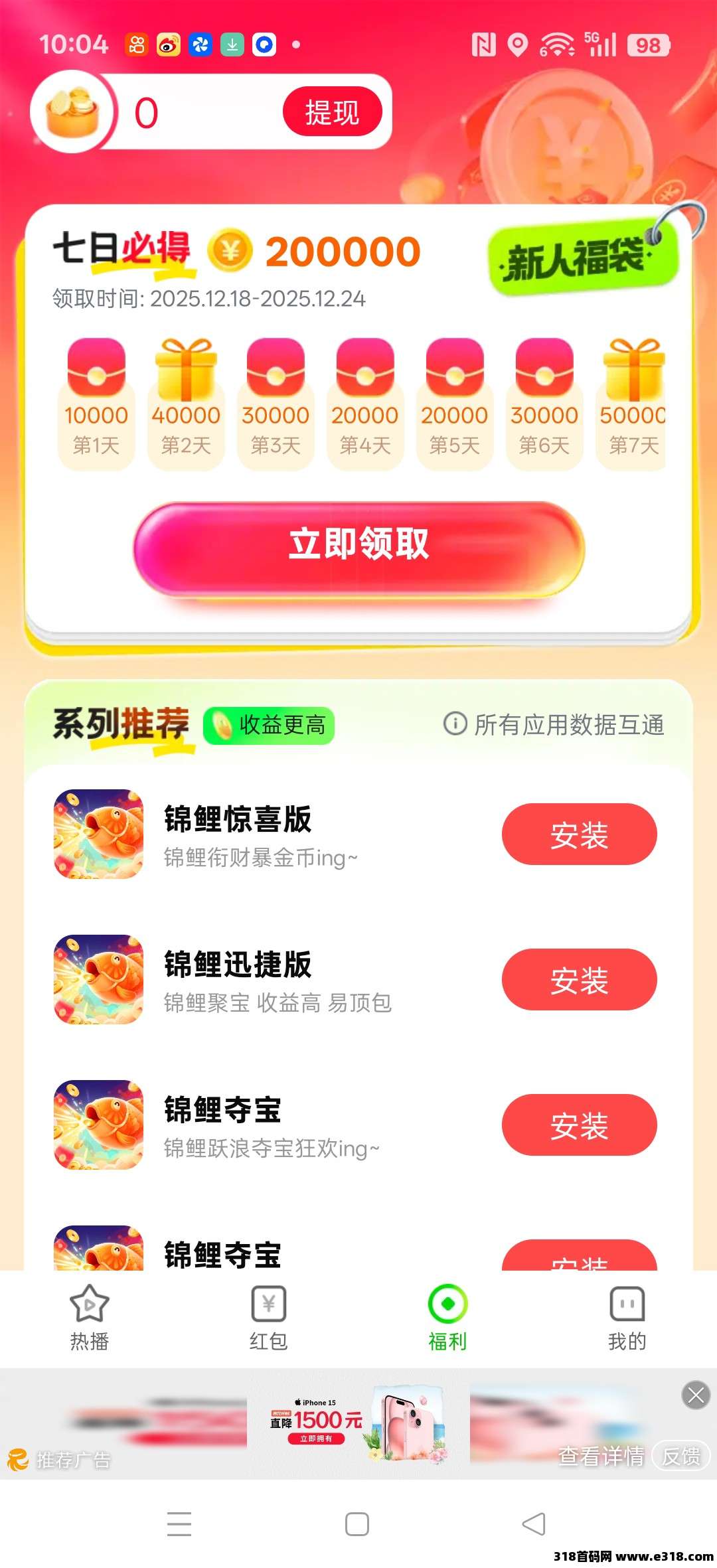 〖锦鲤夺宝〗零撸广告赚,保底收益高,不养机,放水中,自撸一天几十米,邀请日入百米,