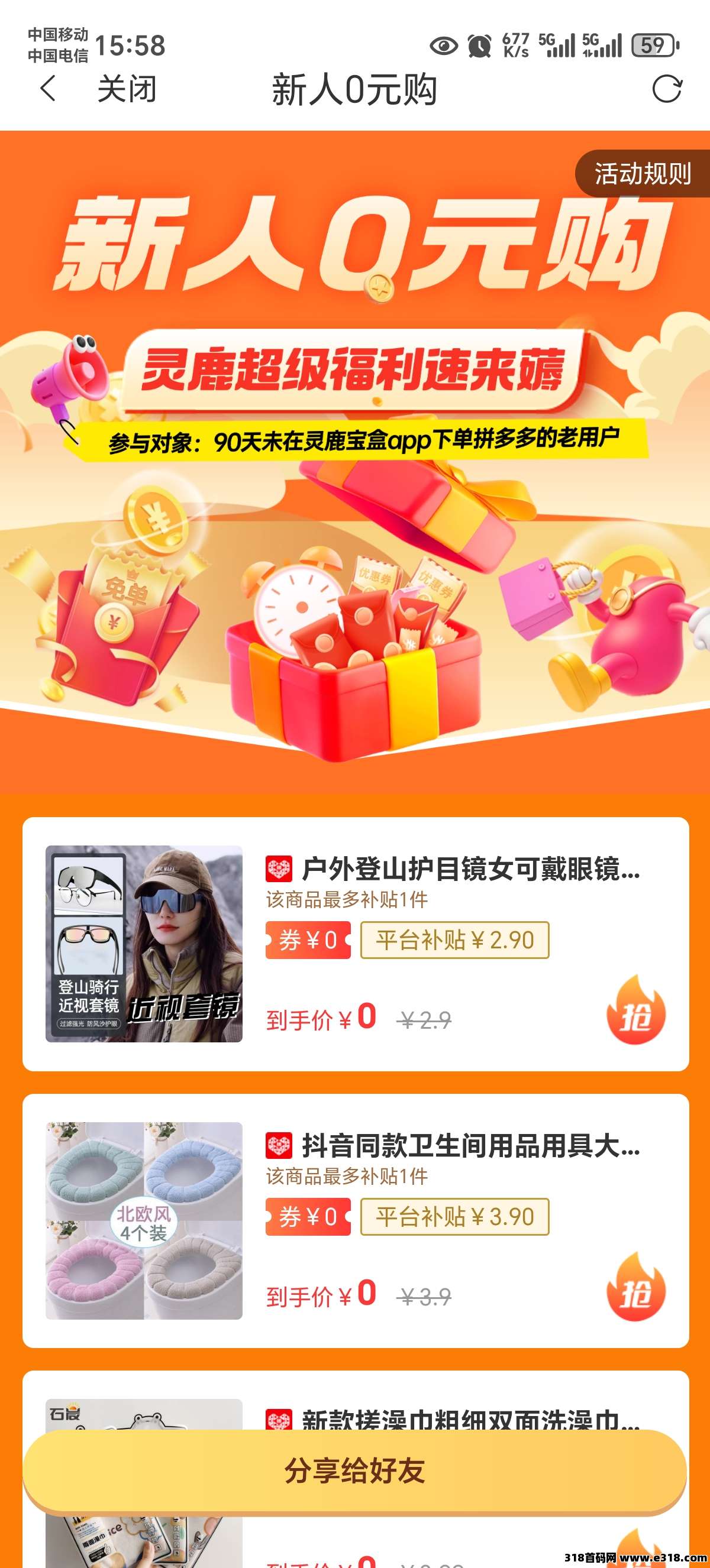 下载完app后,打开登录,到首页,点击“新人0元购”免费薅一款商品!!!