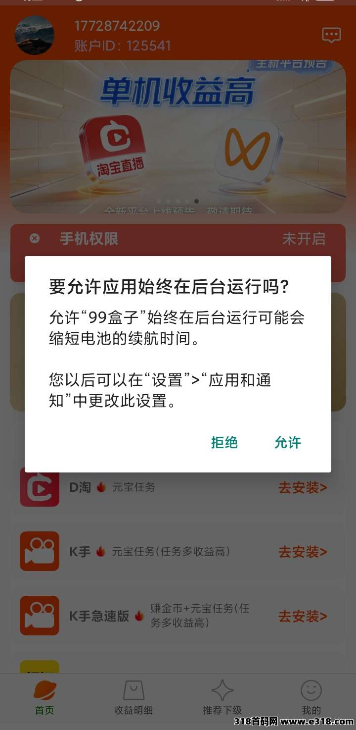 99盒子是一款自带脚|苯的挂|机APP,主要就是通过无人工点赞关注挣零钱,目前单机一天20左右,佣1起吱付宝提米,为小伙伴们多多增收致富。