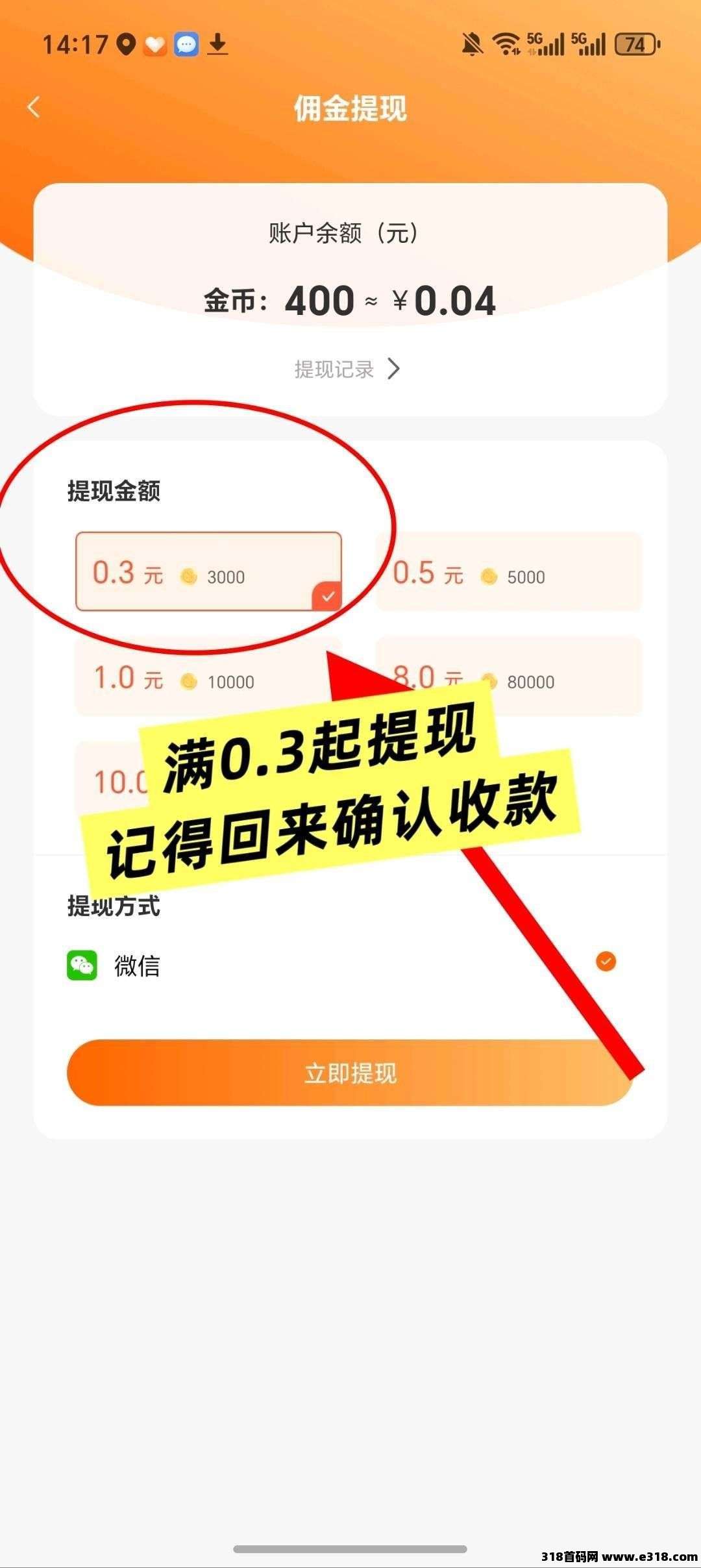 满0.3起提,审核通过后,点开提现记录,再次确认到帐