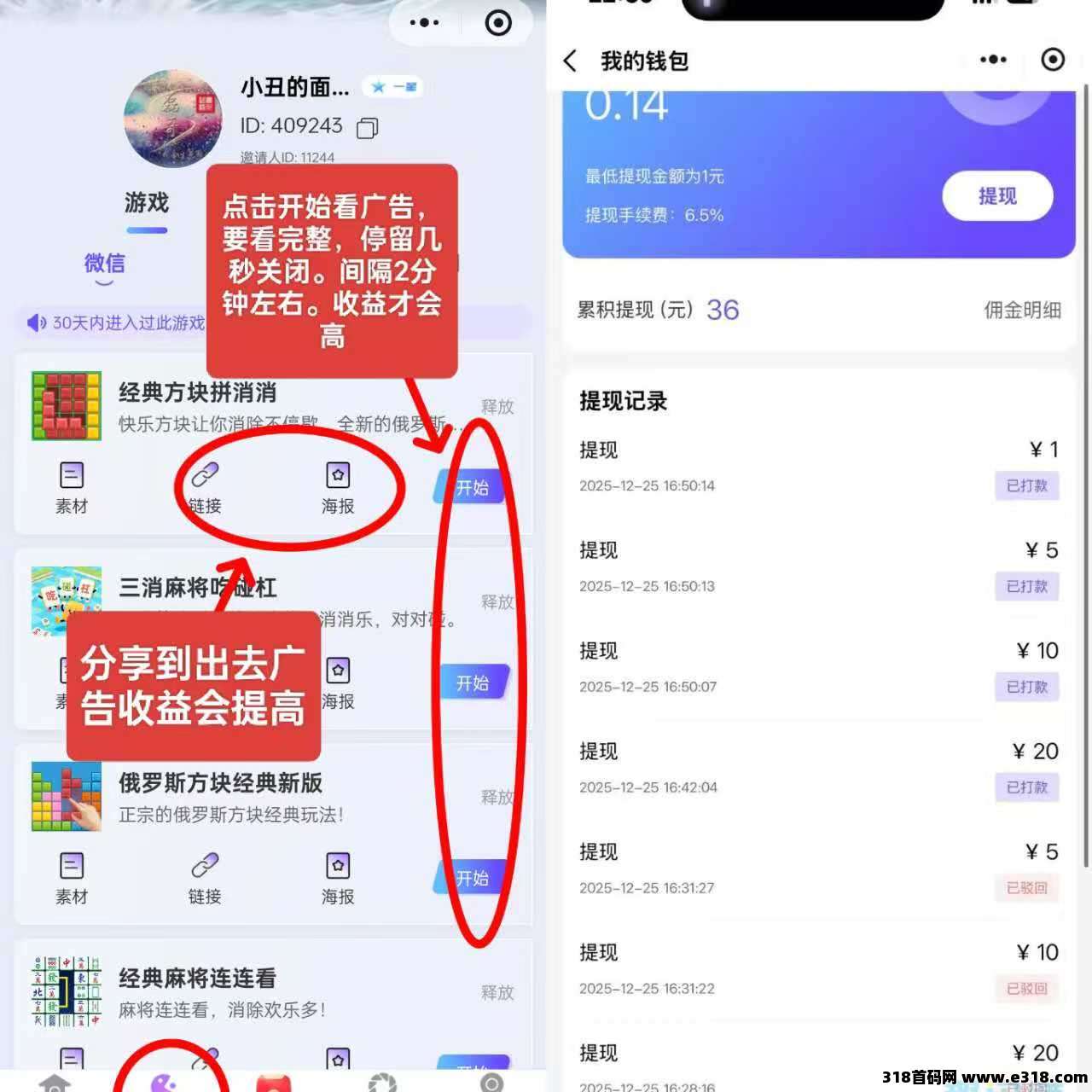 微信小程序小游戏,游戏里看广告就有收益,每人可以再首页申请5个游戏,