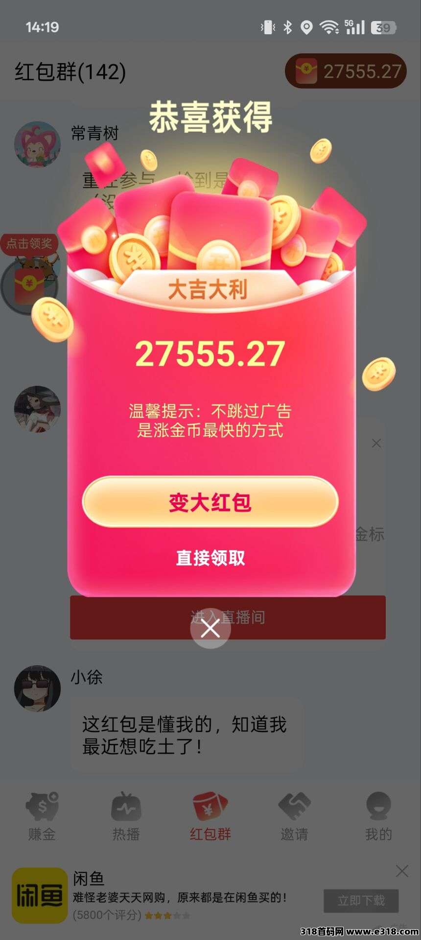 可半自动挂机自动刷广告,打开软件,停留在红包群,就能自动刷广,金币和红包自动上涨,