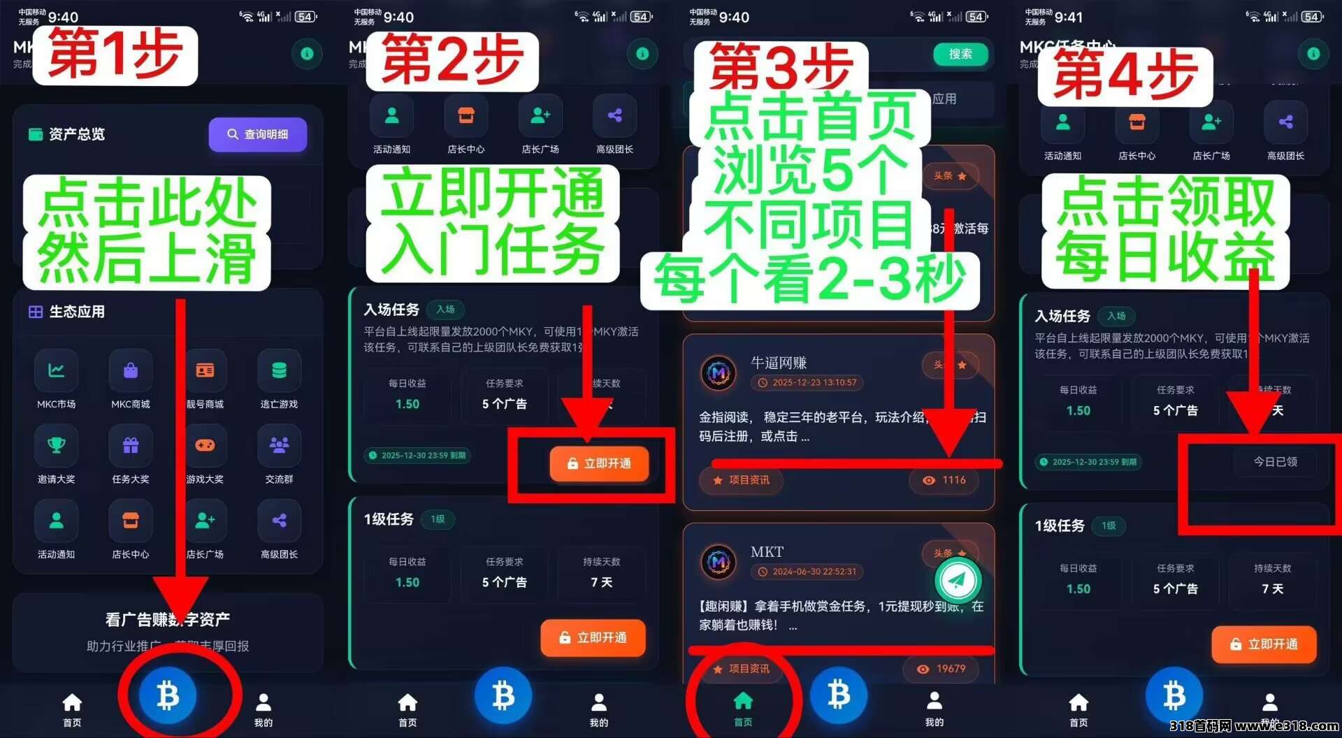 ● 新用户1个MKY开通入场体验任务,每天收益1.5MKC,有效期7天,MKY为免费赠送,可联系他人或_上级免费获取,每人只能开通1次。
