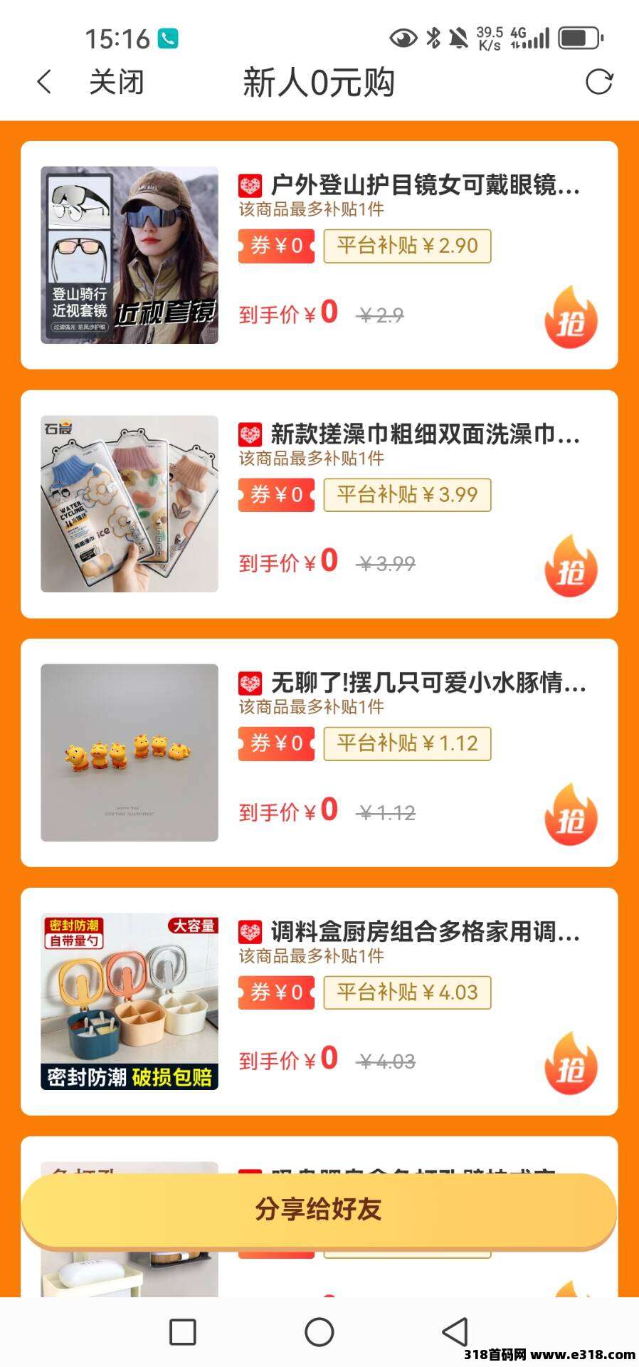 1. 首页“0 元购”专区,首单免费撸实物(抽纸、数据线、洗衣液)。