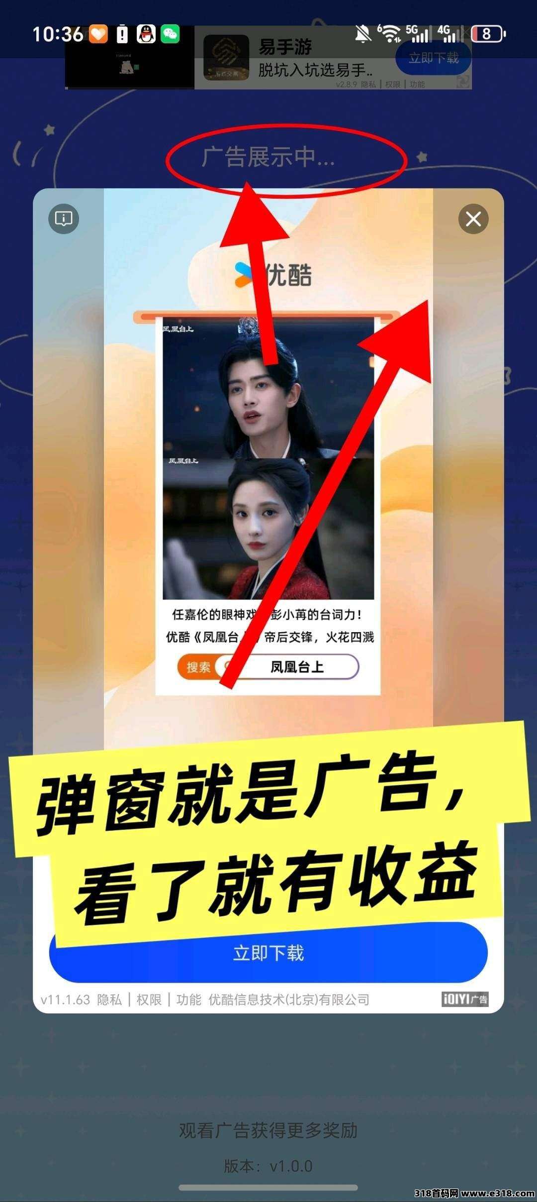 游中盒,零撸广告赚新模式,看弹窗广告,保底收益高,放水中不养机,拉新奖励,邀请日入百米。