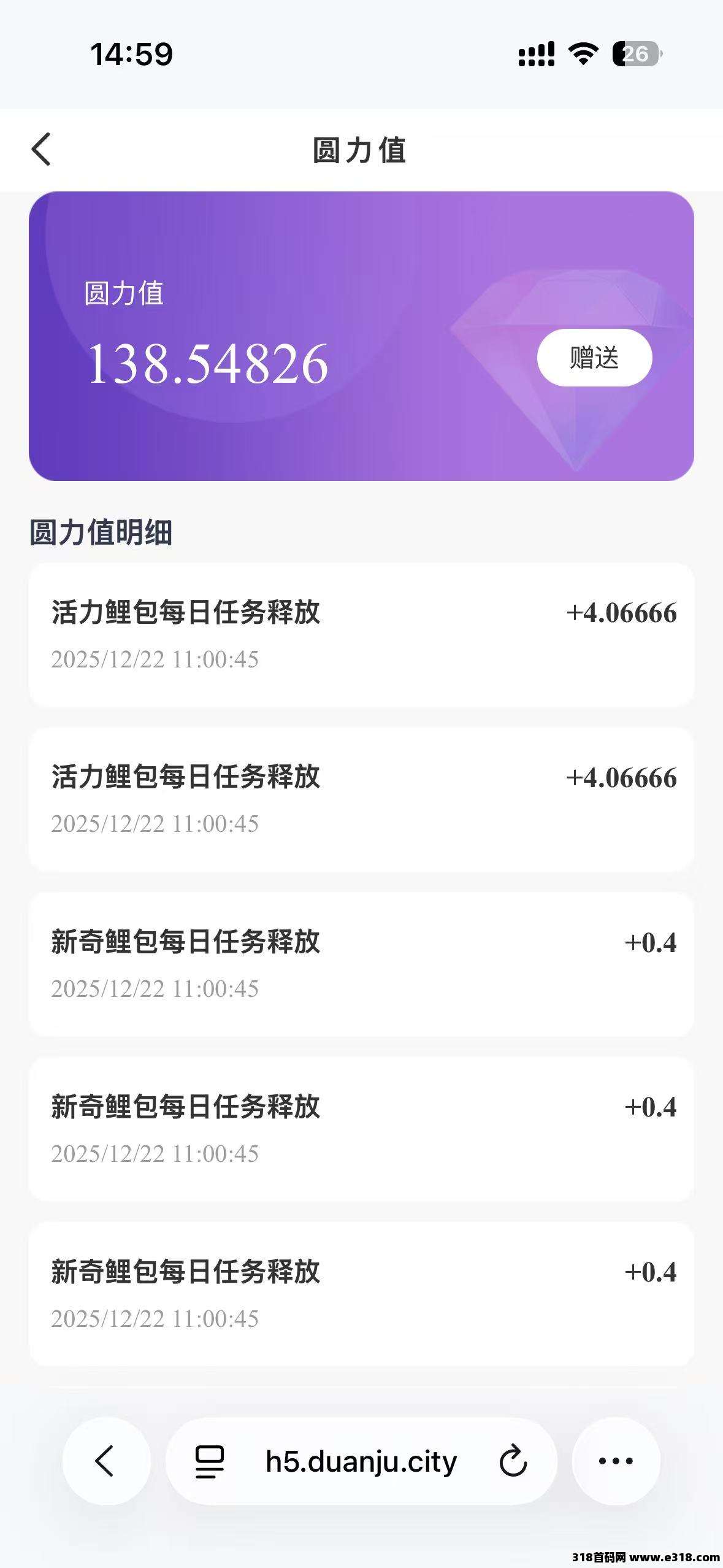 第一个玩法:我们是通过每天看两广告获得100金币完成任务然后释放圆力值一天0.4,三天1个圆力值,1个圆力值7块,随着市场会慢慢的涨,这是个人玩法。