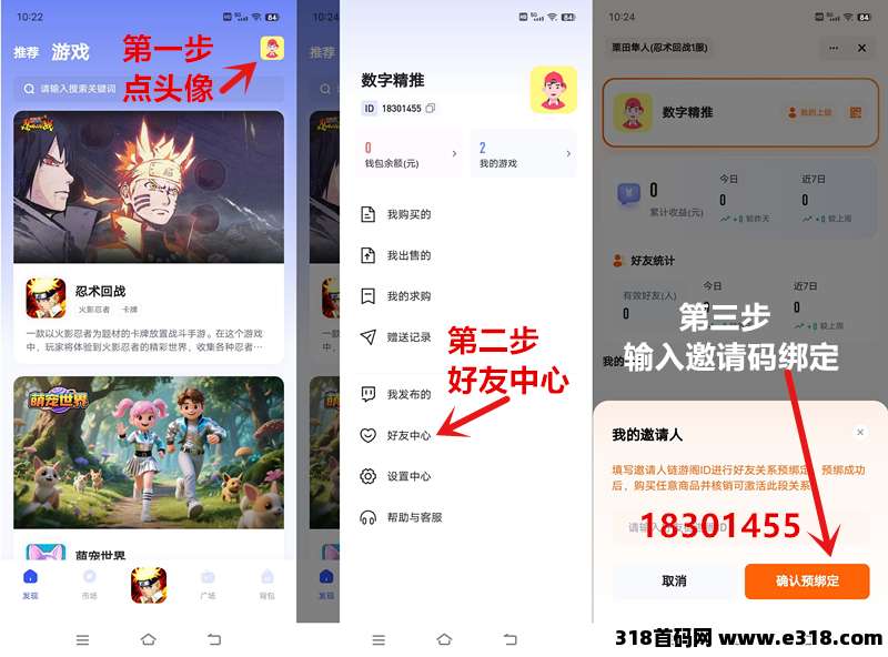 一、下载游戏→点击右上角头像→好友中心→我的上级→输入邀请码18301455绑定