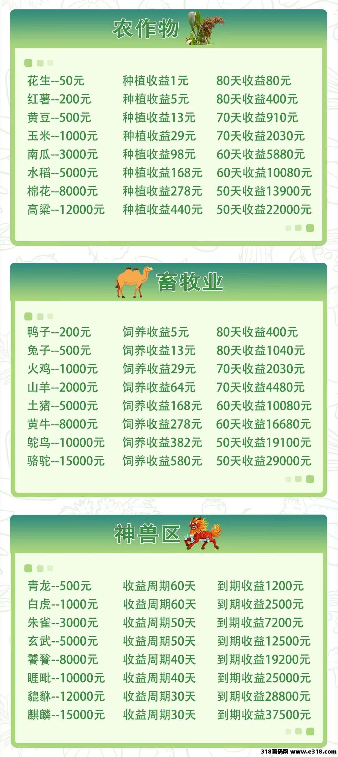 神兽区属于长期养成模式,一次投入、周期结算。