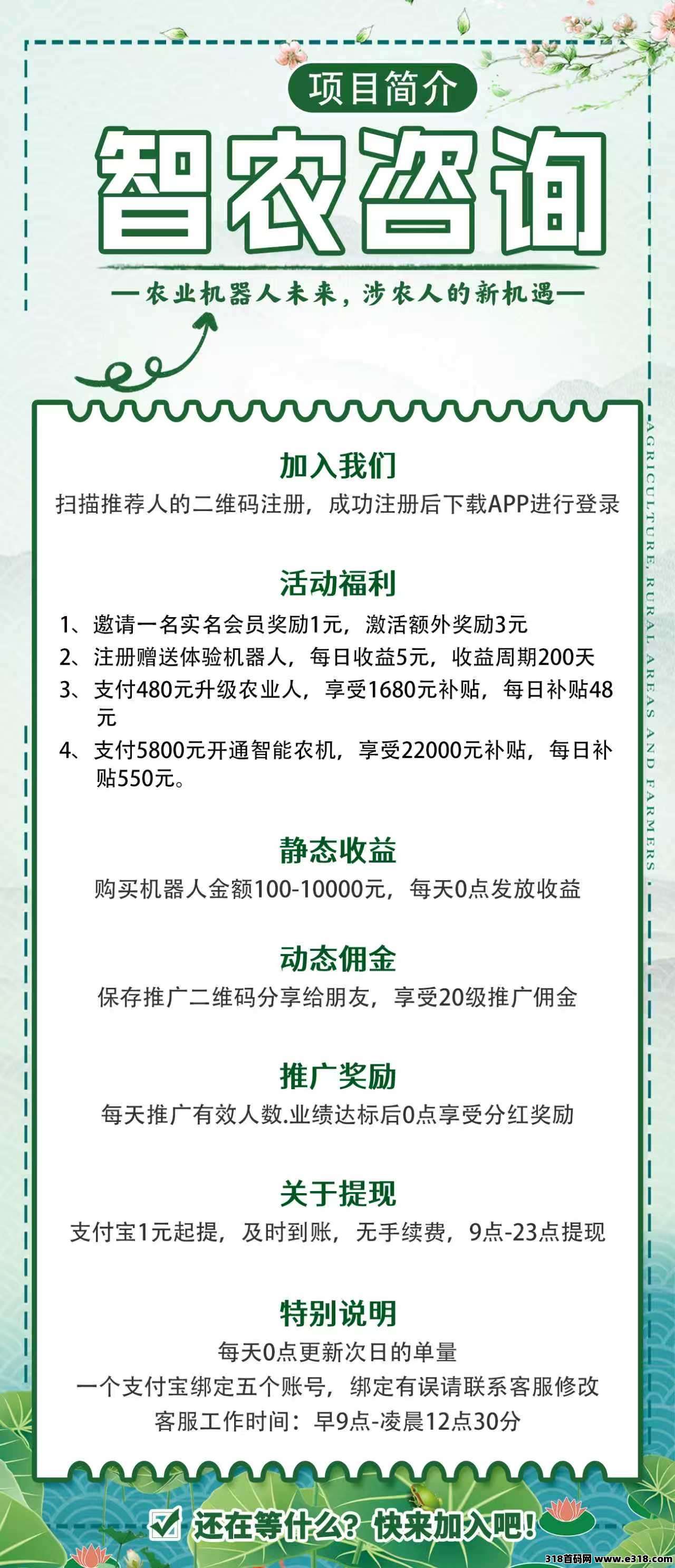 ❤️首码【智农咨询】刚出一秒注册就送机器人每天自动收益5米,推广一人注册1米+有效3米,1米起提秒到,速度推❗️