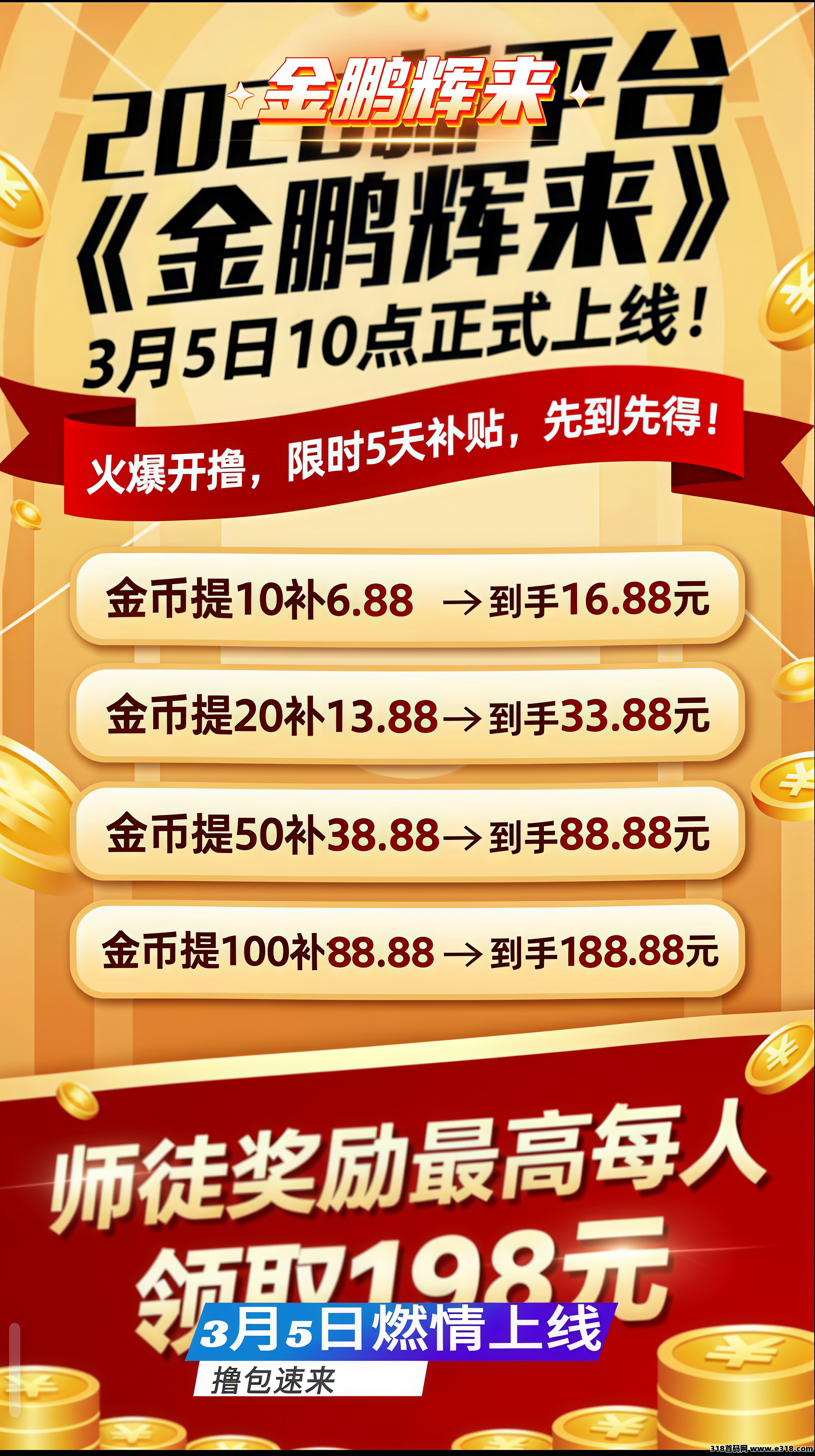 首码金鹏辉来,首次扫码下载即享高额扶持,军团模式,零撸看广告,不养机保底收益高,放水补贴高,单机每天30-50+,邀请日入百米,免费提供不养机玩法教程,扶持拉满,待遇置顶!