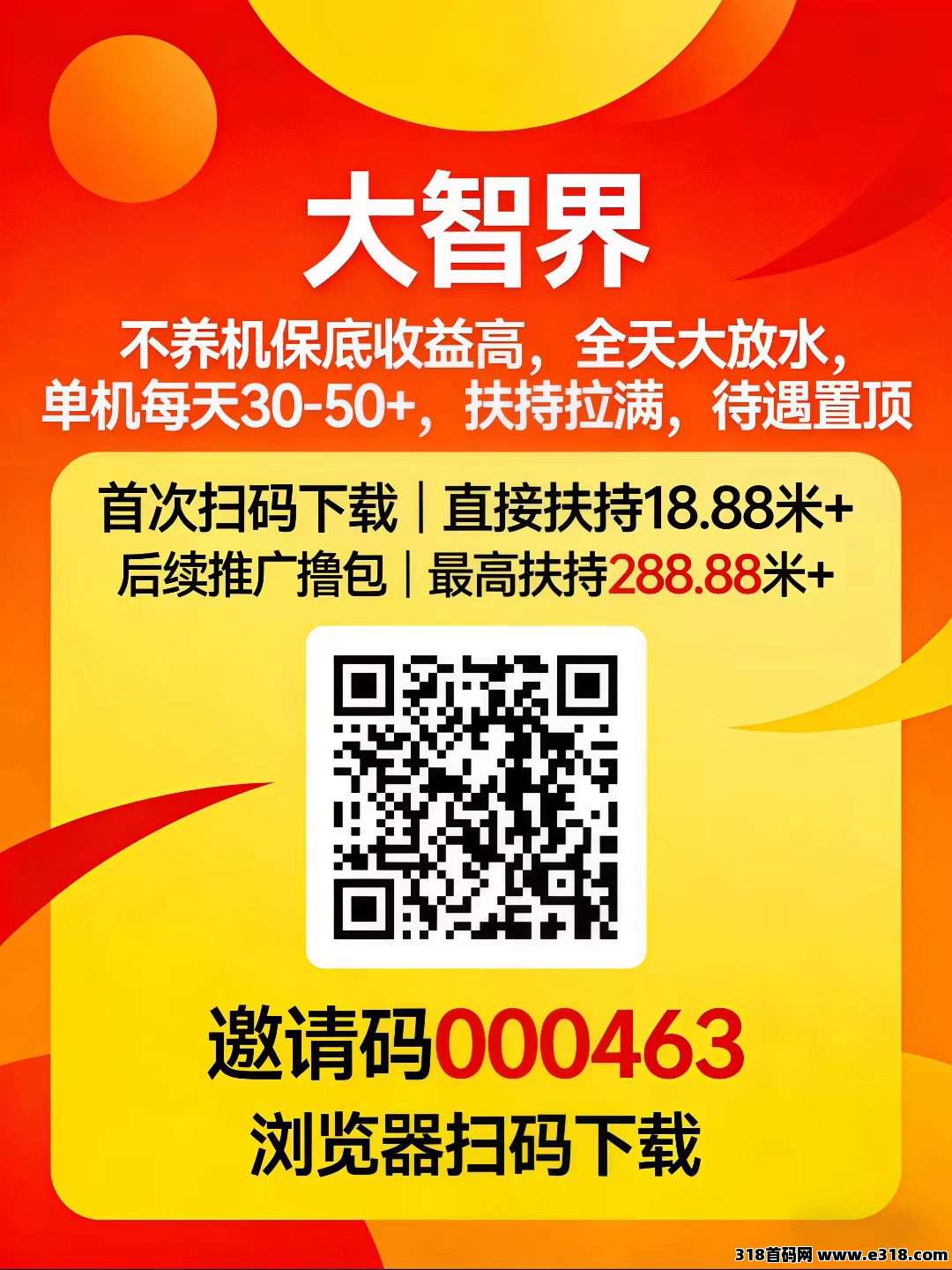 首码大智界,首次扫码下载即享高额扶持,军团模式,零撸看广告,不养机保底收益高,放水补贴高,单机每天30-50+,邀请日入百米,免费提供不养机玩法教程,扶持拉满,待遇置顶!