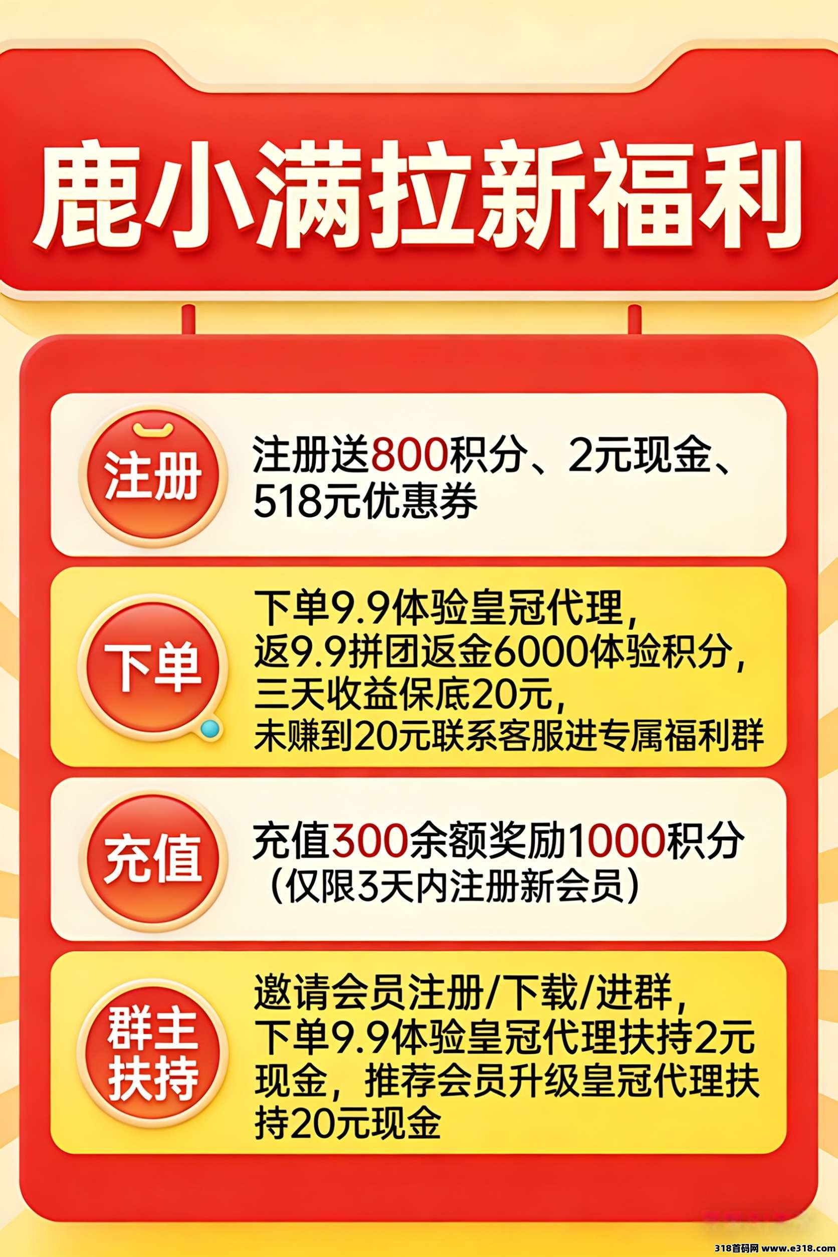 下单福利:9.9元体验皇冠代理,返9.9元拼团金,3天收益翻倍;5单内拼中再扶持10元拼团金;下单皇冠代理奖8000积分+400贡献值;下单内测福利奖25000积分+1000贡献值
