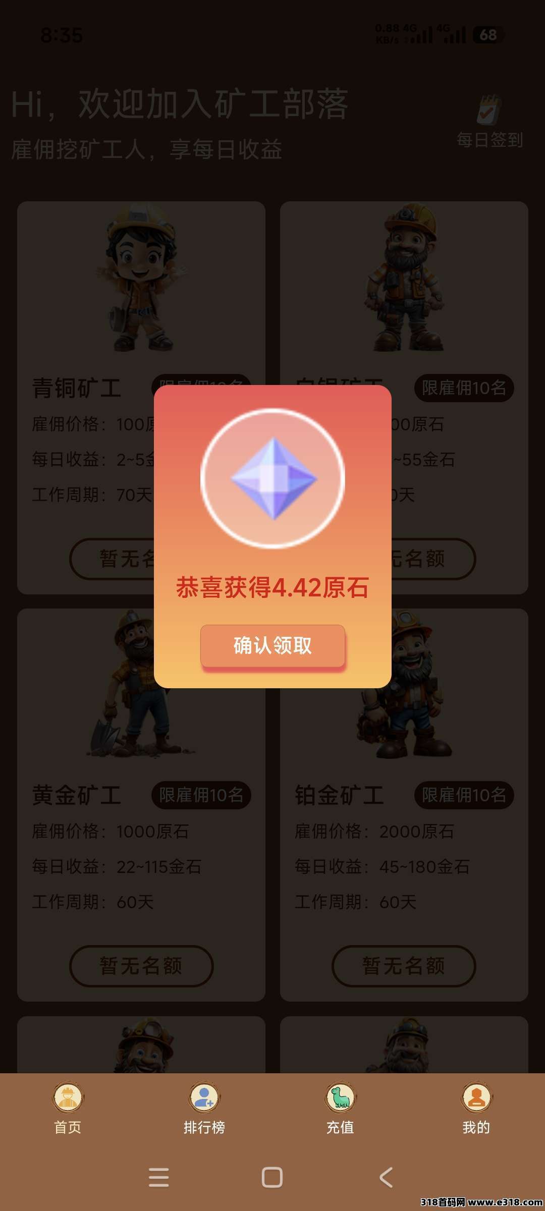 矿工部落,白嫖上线,速度冲冲冲,每天签到2-5原石,一个支付宝可绑定三个号,提现秒到账。