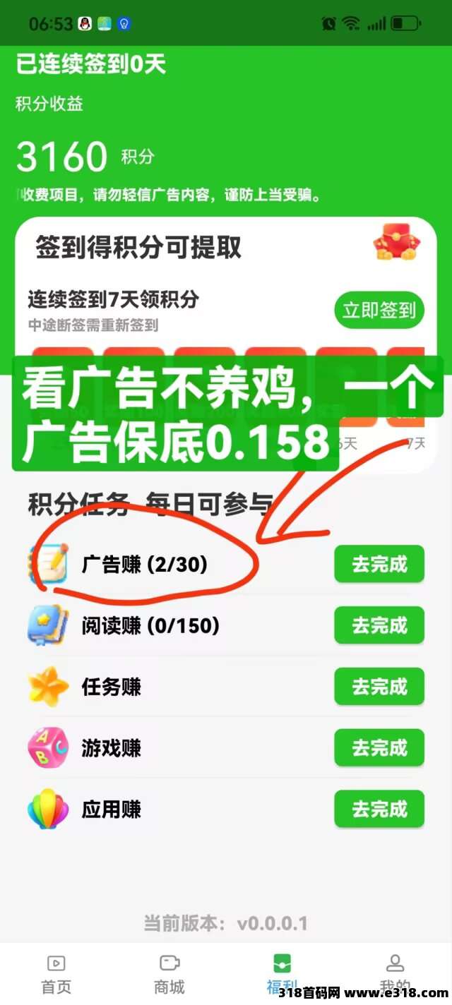 首码数影时代刚出,看广告不养机,一个广告保底0.15每天30个,1元起提