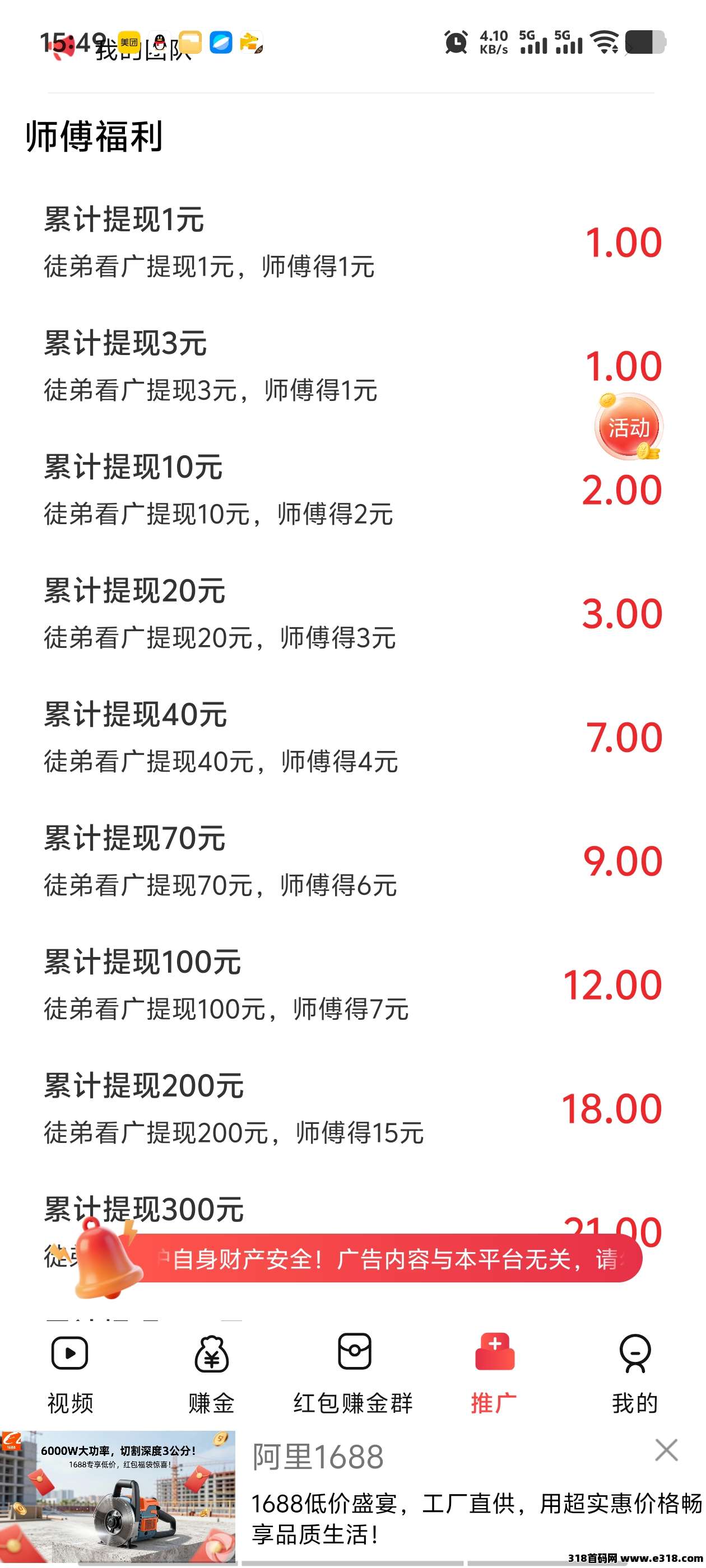 全新台子,可0撸广告赚米!这可是大公司,非常靠谱。全程零撸,你随时随地想赚就赚,提现还能秒到账!这是个纯零撸、纯看广告的APP,每天有80个广告,看广告收益在0.1 - 1之间,相当可观,1米起提!单号保底润8米一天