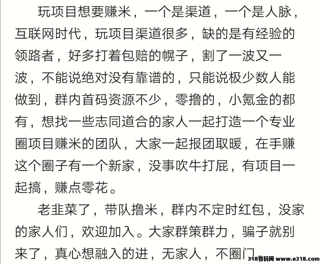 个人观点:建议合成尽量别去搞,不贪多基本不会亏,每天戏水长流呗,项目方有一定格局,预计维持2月不难,玩的趁早,放20个包p名额,先来先得下不了车算我的,只要你及时变现不贪,后面入场的只能领扶持了,群内交流吧,玉包回收
