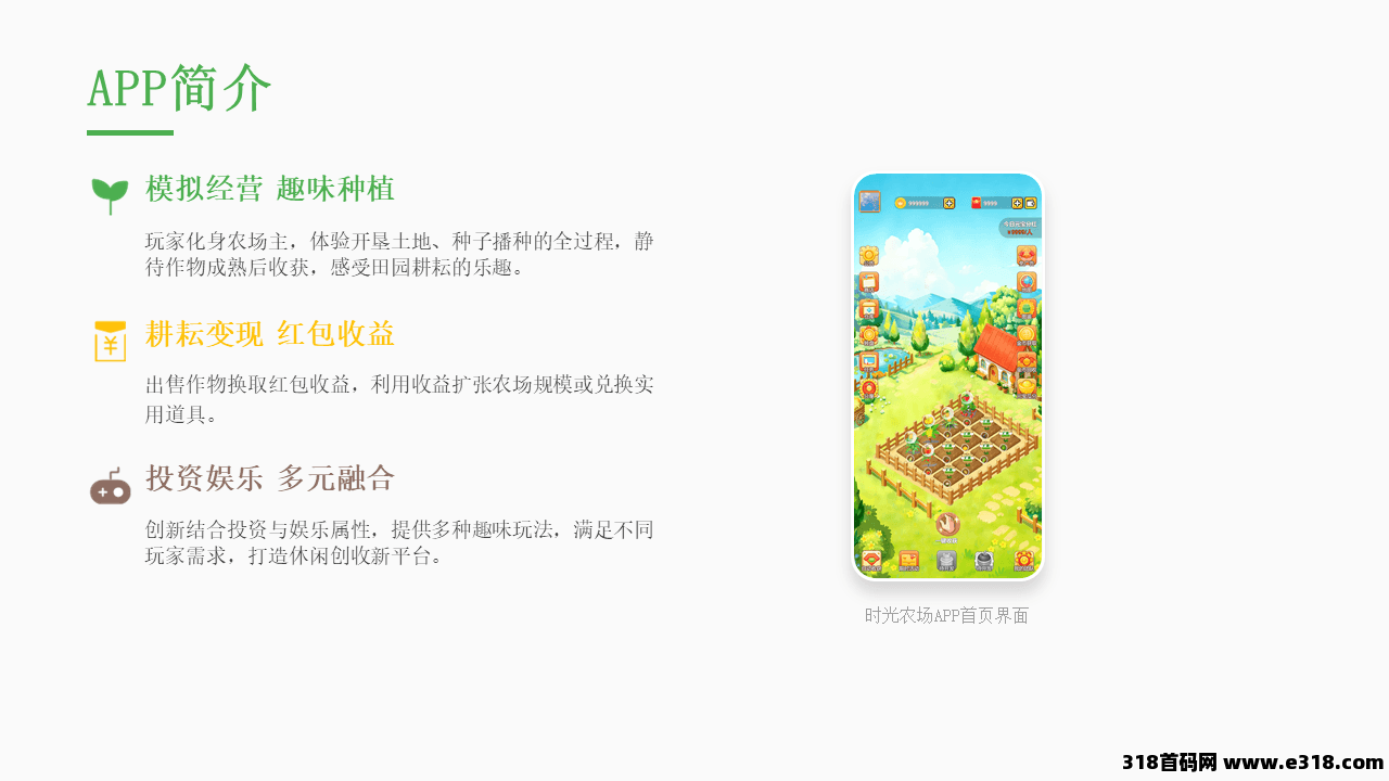 时光农场是一款模拟经营农场种植APP,玩家扮演农场主,开垦土地、购买种子播种,作物成熟后收获并卖出,用于扩张农场、换取道具等红包收益,时光农场还提供了多种有趣的玩法, 为玩家提供了投资和娱乐相结合的机会。通过多元化的玩法和实时提现的特色,吸引了众多玩家的关注。立即加入时光农场,体验经营农场的乐趣,获取丰厚的收益