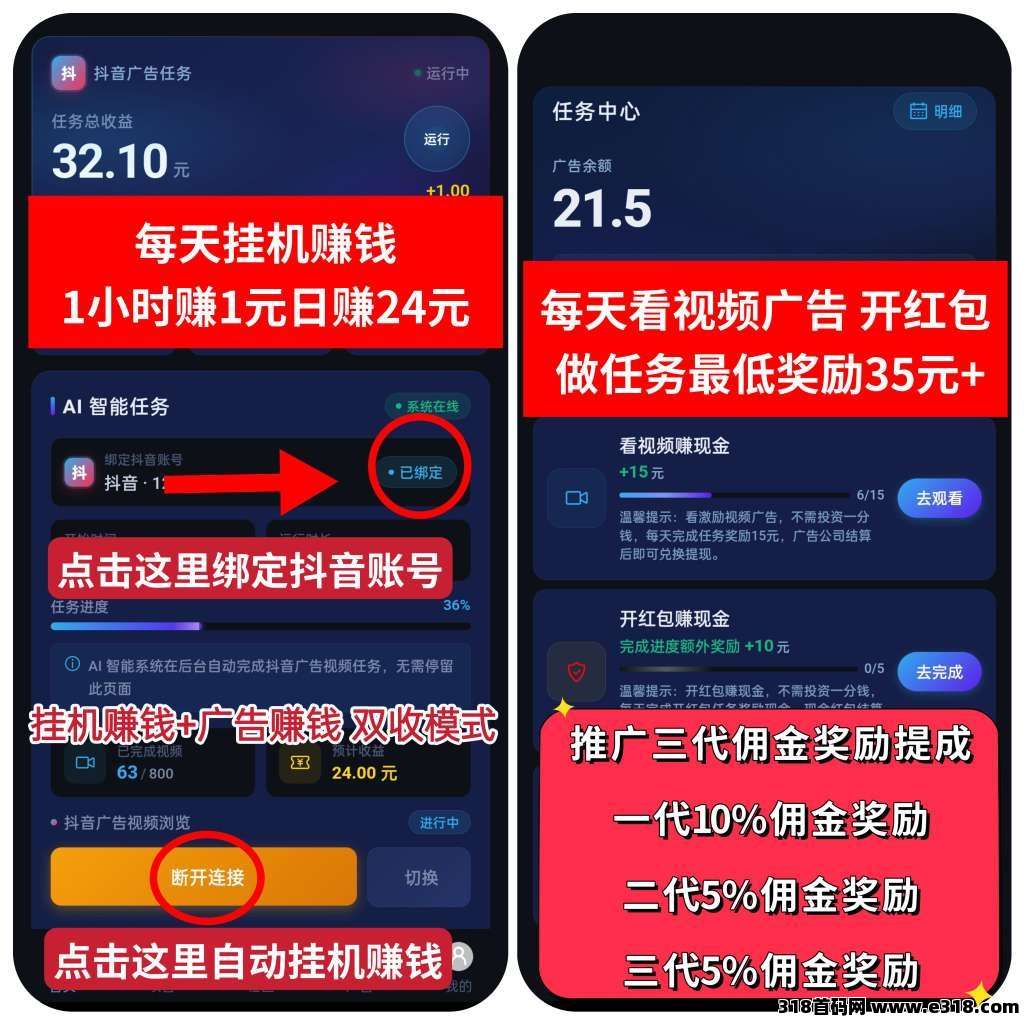 **赚钱①:绑定抖音账号,开启建立连接,然后开通托管服务,让你的抖音账号,24小时自动挂机为你赚钱,月赚720元。
